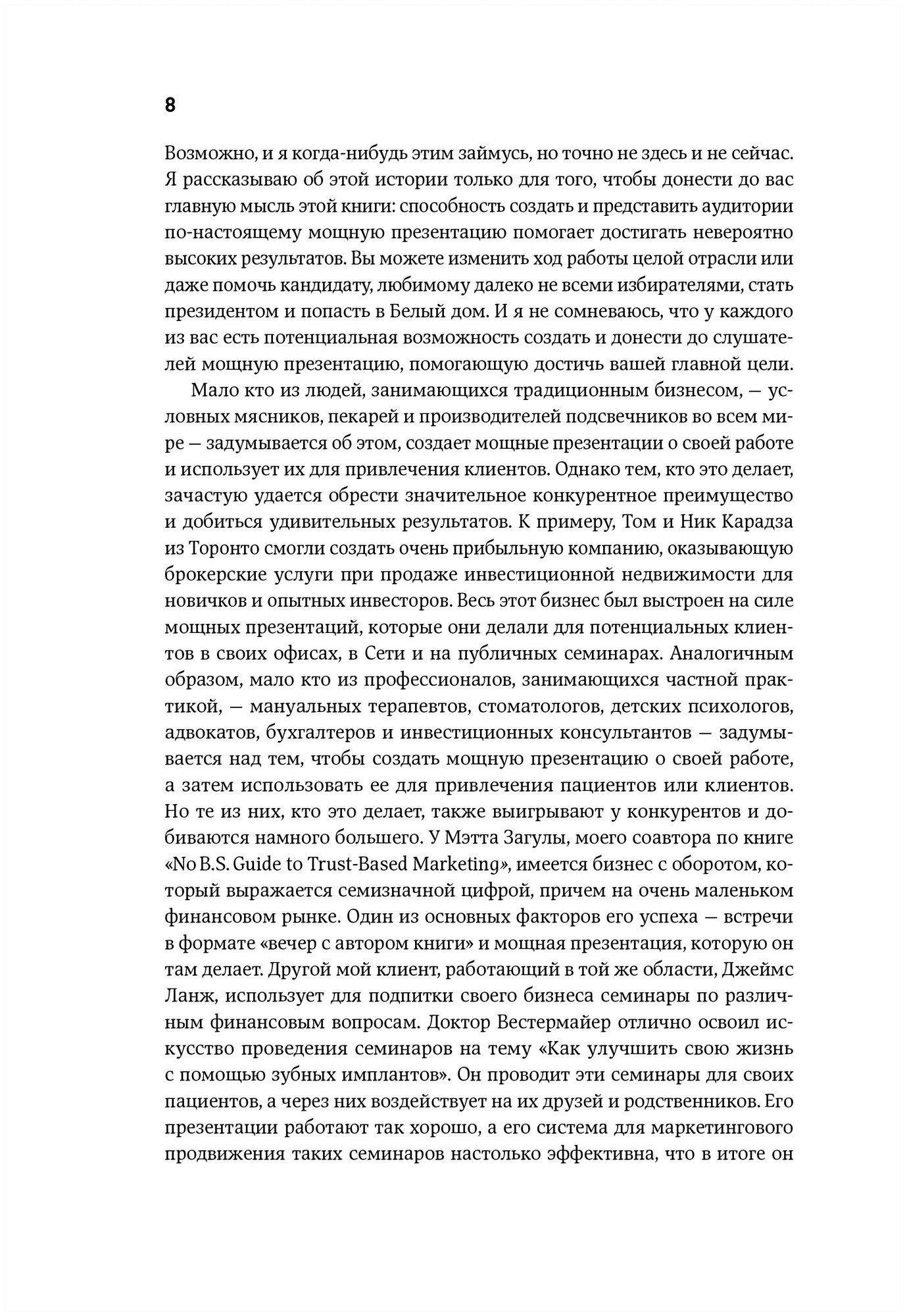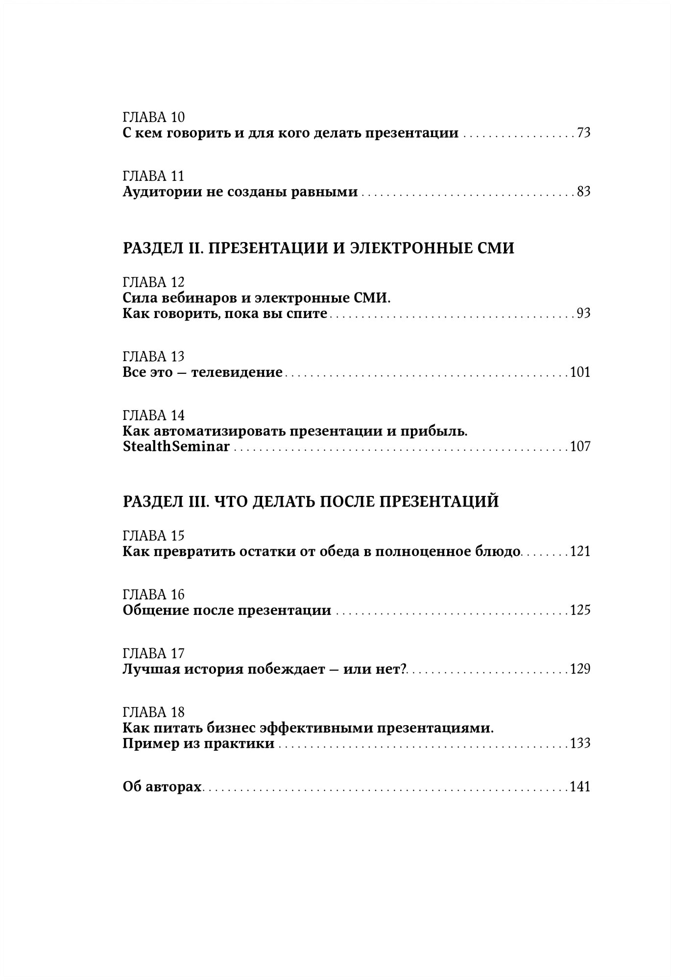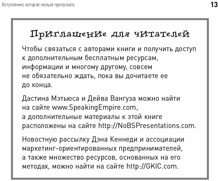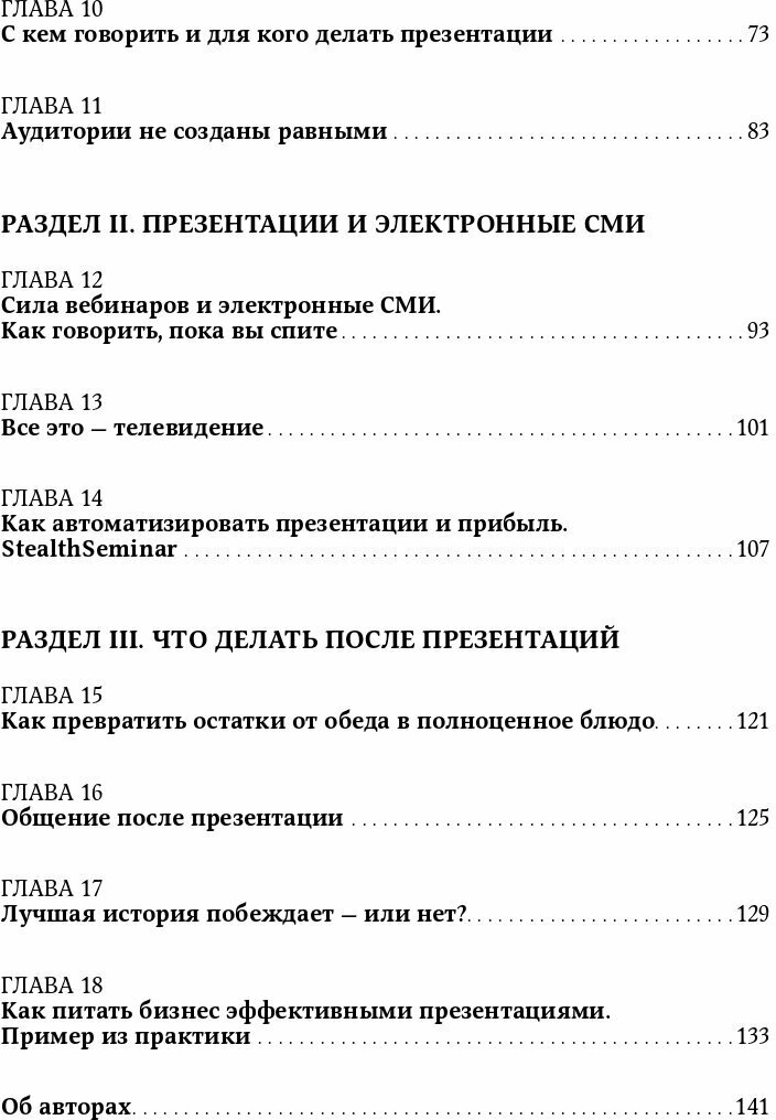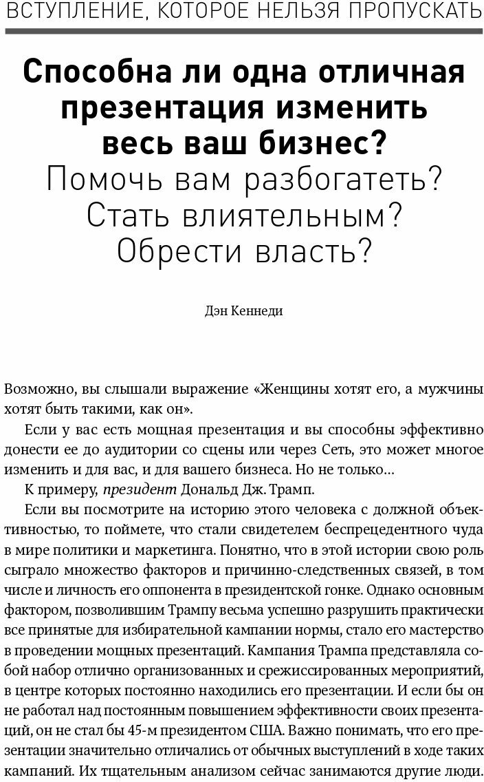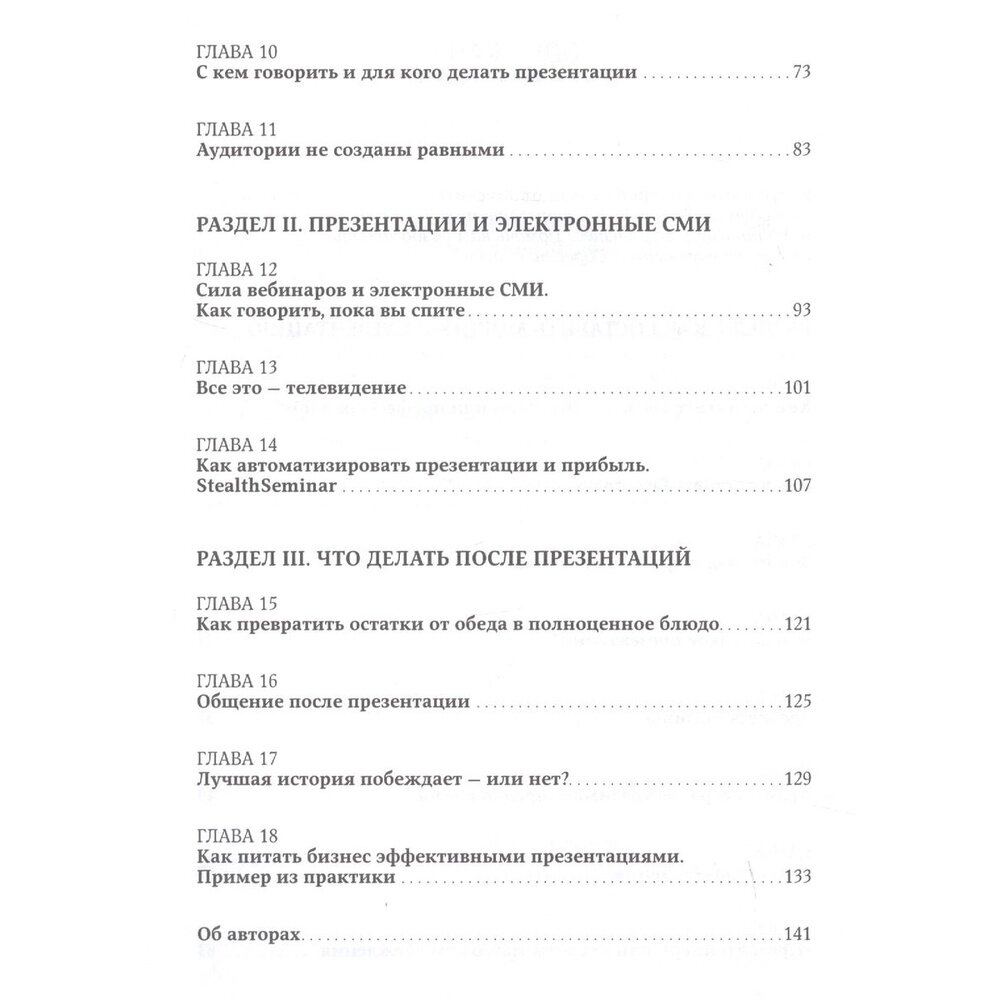 Времена PowerPoint остались в прошлом: сейчас вам на помощь придут вебинары и социальные сети. В своей привычной бескомпромиссной манере Кеннеди расскажет, как понять, что нужно конкретной аудитории, как выступать без страха и быть убедительным. Даже если вы не собираетесь покорять мир новой бизнес-идеей, умение эффективно доносить свои мысли всегда вам пригодится."