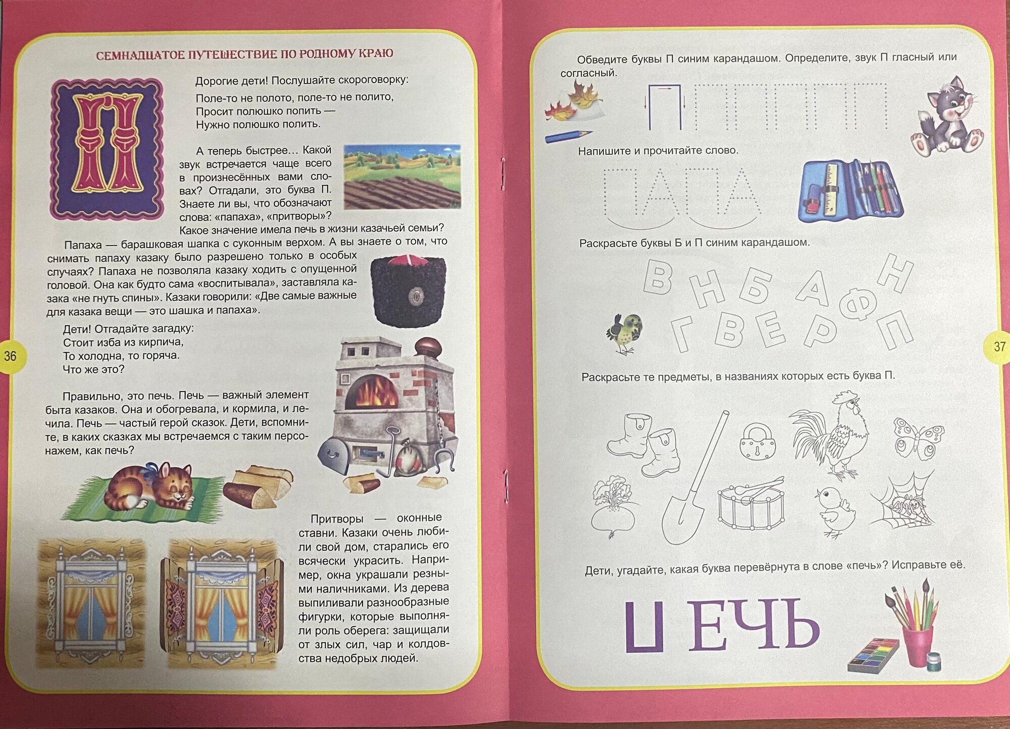 Пособие Азбука для маленьких казаков и казачек предназначено для проведения групповых и индивидуальных занятий с детьми 5-7 лет и включает в себяпутеводитель в мир истории и культуры родной страны;детскую энциклопедию, знакомящую малышей с жизнью казаков России,дневник общения детей со сверстниками и взрослыми:беседы-диалоги о семейных казачьих традициях, ремеслах, быте, произведениях искусства.Кроме того, в этой книге ребёнка ждёт справочник по подготовке к обучению в школе:работа с буквами, звуками и словами, упражнения по развитию мелкой моторики ребёнка и подго-товки руки к письму.Игры, подобранные в пособии, способствуют развитию внимания, восприятия, памяти и мышления.
