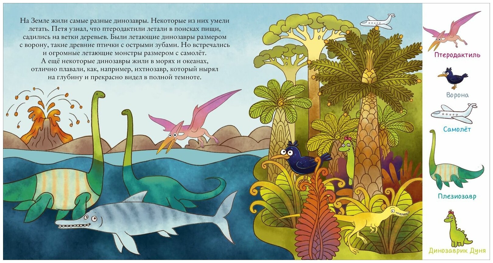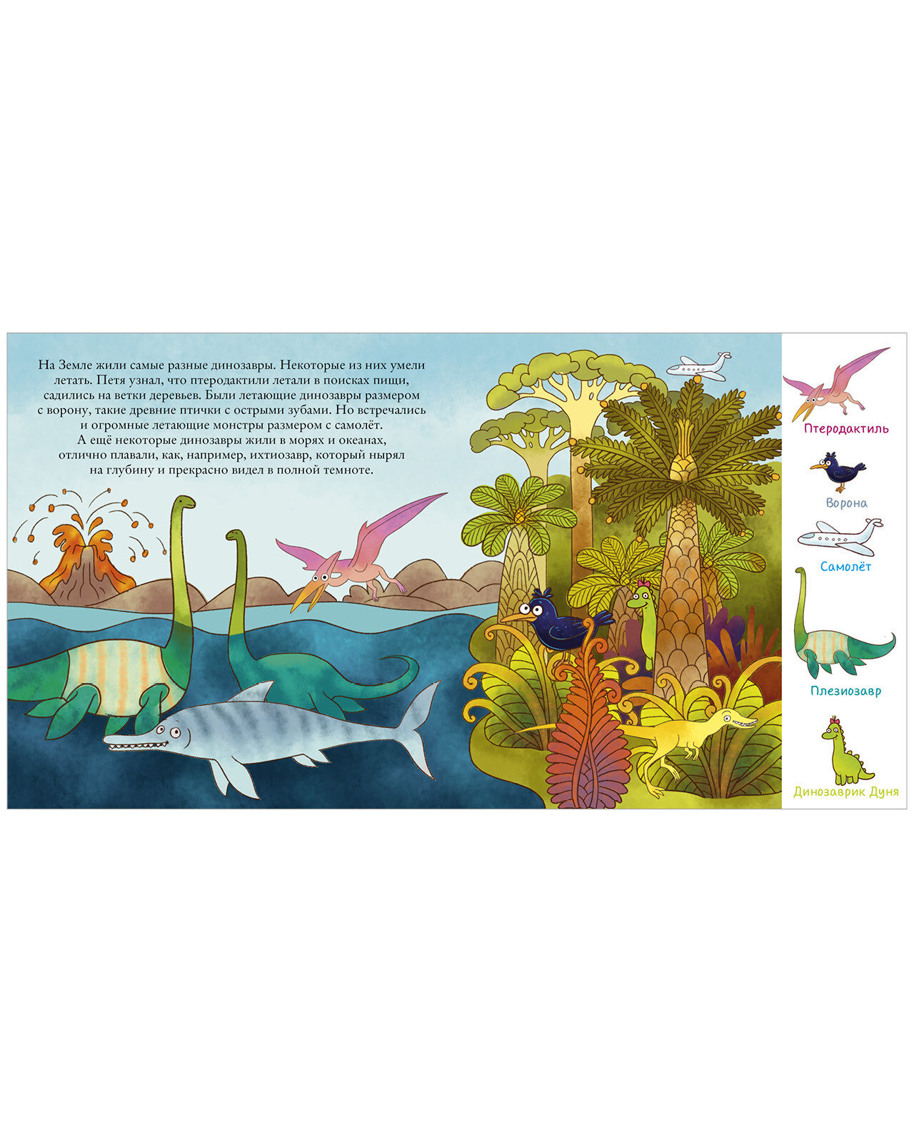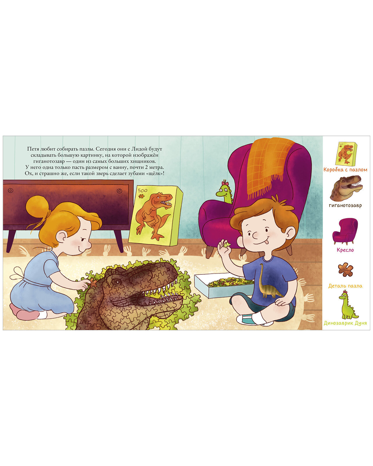 Книга «Найди и покажи, малыш. Динозавры» откроет вашему ребенку множество интересных фактов о динозаврах! В игровой форме вы узнаете, что у стегозавра мозг был размером с грецкий орех, а у гиганотозавра — пасть размером с ванную. В путешествии по миру динозавров малыша будут сопровождать очаровательные персонажи Петя и Лида, а также динозаврик Дуня, которую придется отыскивать на каждом развороте.Сюжетные иллюстрации позволят сочинить множество историй и обсудить не только среду обитания, но и самые обычные бытовые вещи, окружающие ребенка. Сон, чистка зубов, сбор чемодана, времена года — темы, которые так или иначе поднимаются на панорамных картинках в книге «Найди и покажи, малыш. Динозавры».