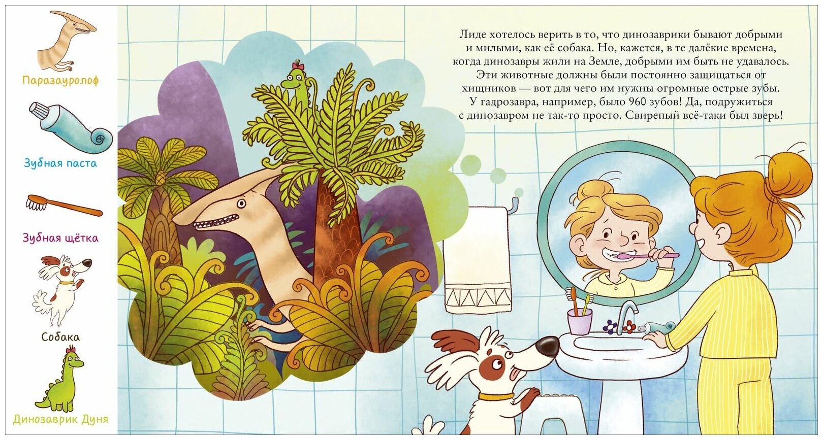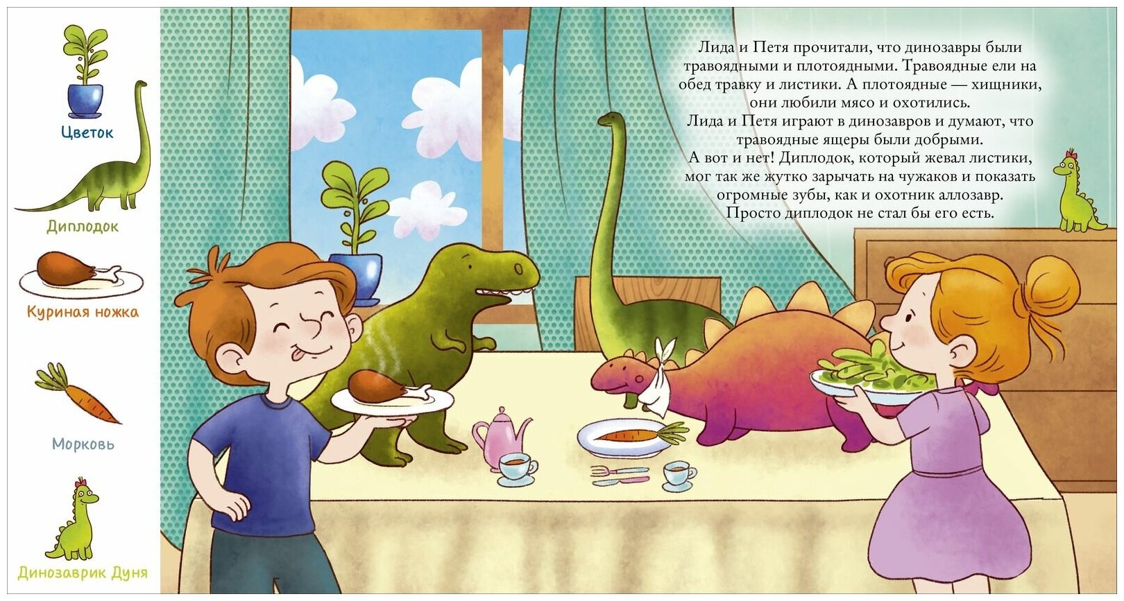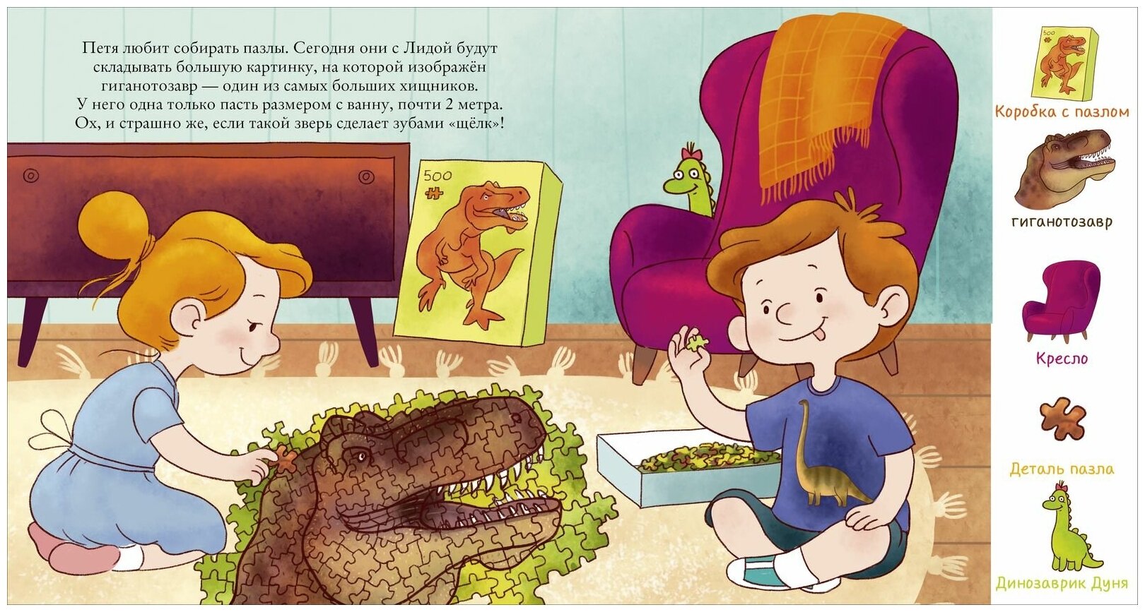 Книга «Найди и покажи, малыш. Динозавры» откроет вашему ребенку множество интересных фактов о динозаврах! В игровой форме вы узнаете, что у стегозавра мозг был размером с грецкий орех, а у гиганотозавра — пасть размером с ванную. В путешествии по миру динозавров малыша будут сопровождать очаровательные персонажи Петя и Лида, а также динозаврик Дуня, которую придется отыскивать на каждом развороте.Сюжетные иллюстрации позволят сочинить множество историй и обсудить не только среду обитания, но и самые обычные бытовые вещи, окружающие ребенка. Сон, чистка зубов, сбор чемодана, времена года — темы, которые так или иначе поднимаются на панорамных картинках в книге «Найди и покажи, малыш. Динозавры».