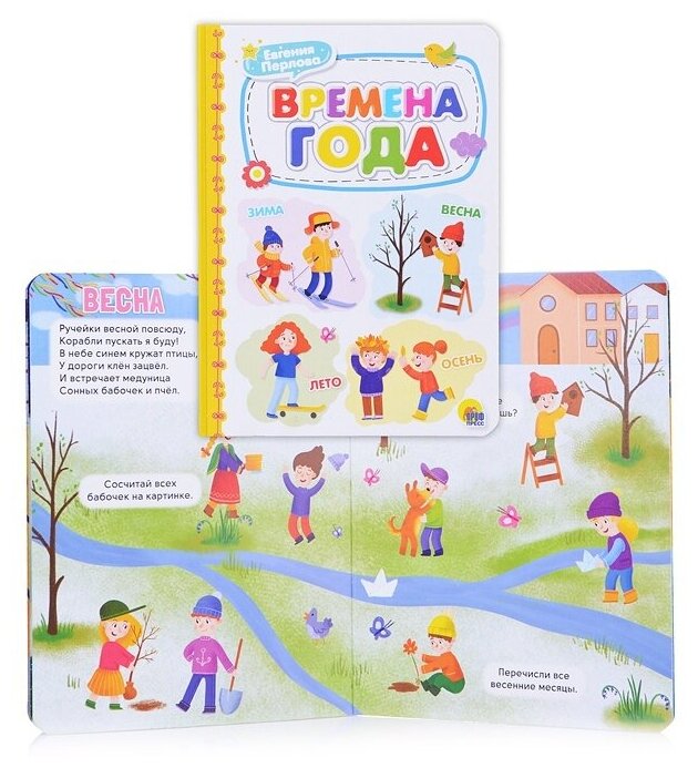 Книга понравилась. Хороший формат, удобна для чтения. Плотные картонные страницы и яркая печать. На каждом развороте об одном из времён года, иллюстрации простые, компьютерные, в мягких цветах, но много разных деталей. Есть задания, вопросы к картинкам о временах года. В целом подойдёт малышу порассматривать. Хорошее издание за свою цену.