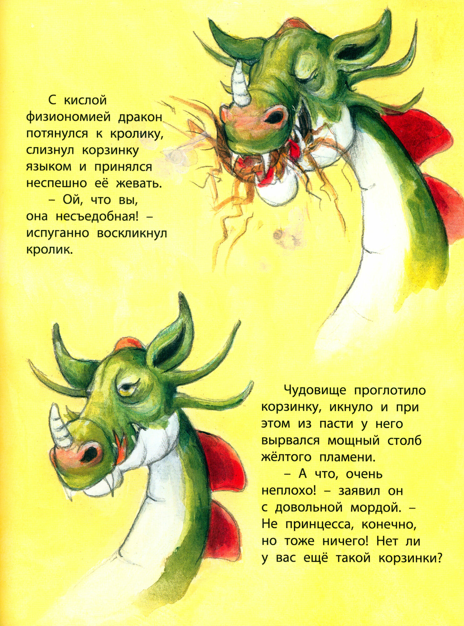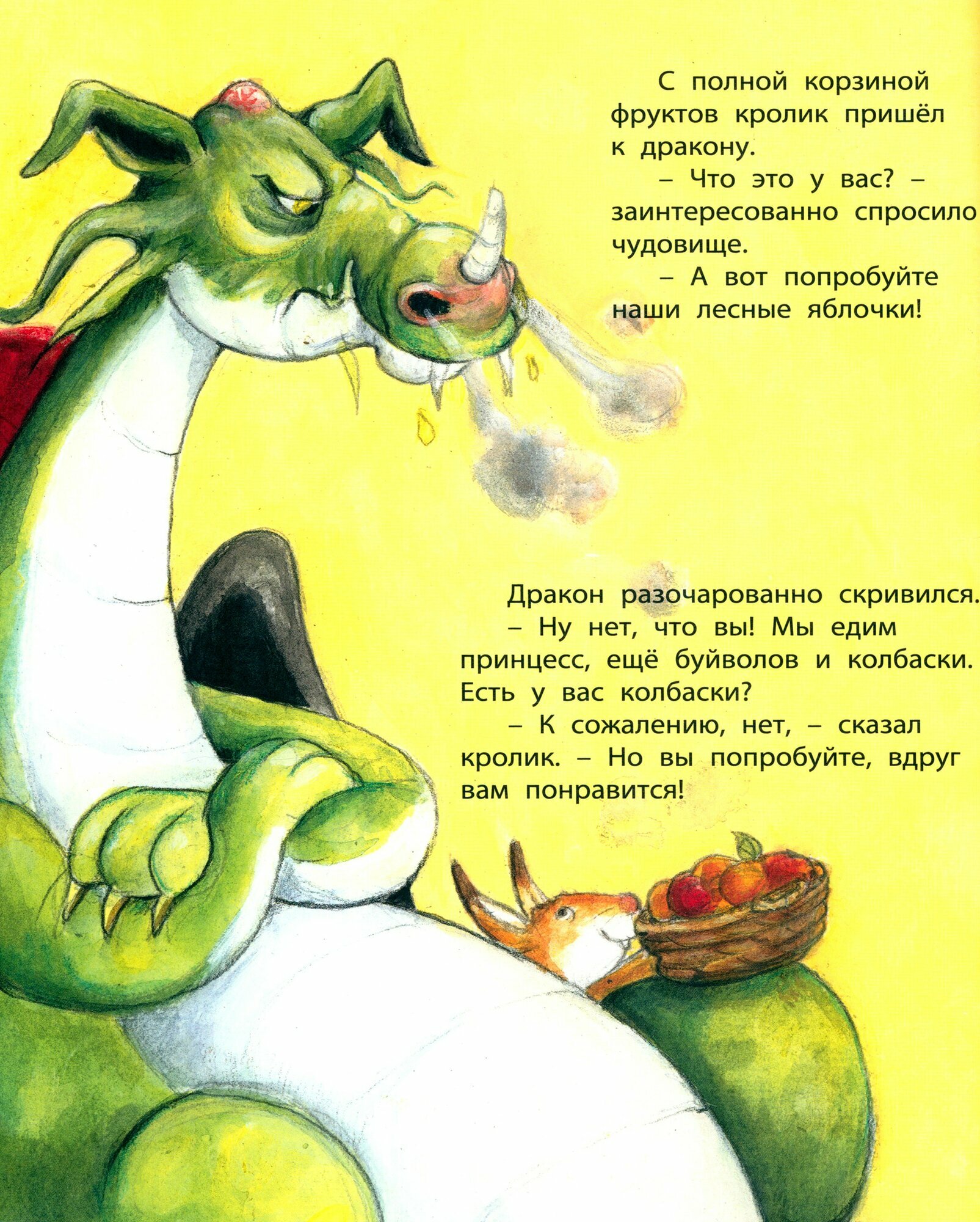Это первая история в книге. Всего их три. В остальных рассказываются другие курьезы из жизни лесных друзей и дракона. Во все историях можно найти очень приятную мораль, но хорошо спрятанную. Например, какие мысли возникнут у ребенка, когда он прочитает, что друзья решают не приглашать дракона на пикник из-за того, что он не очень вписывается в компанию. Не зовут его оттого, что он не такой как они, а большой и неуклюжий. В итоге дракон даже не обижается (это мне очень понравилось), а помогает друзьям. Как раз его размеры позволяют спрятать всю компанию от дождя. Звери все поняли и извинились.