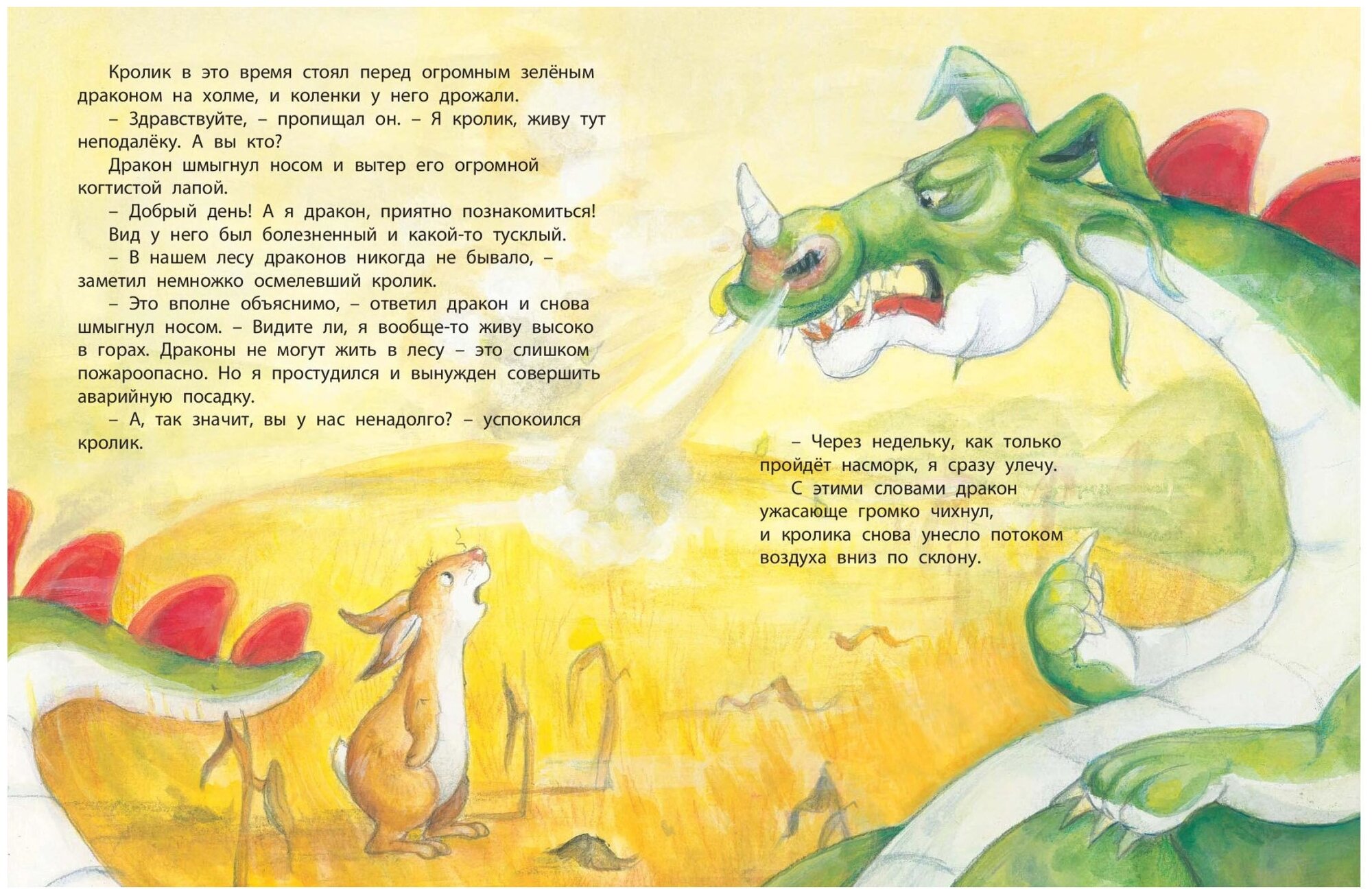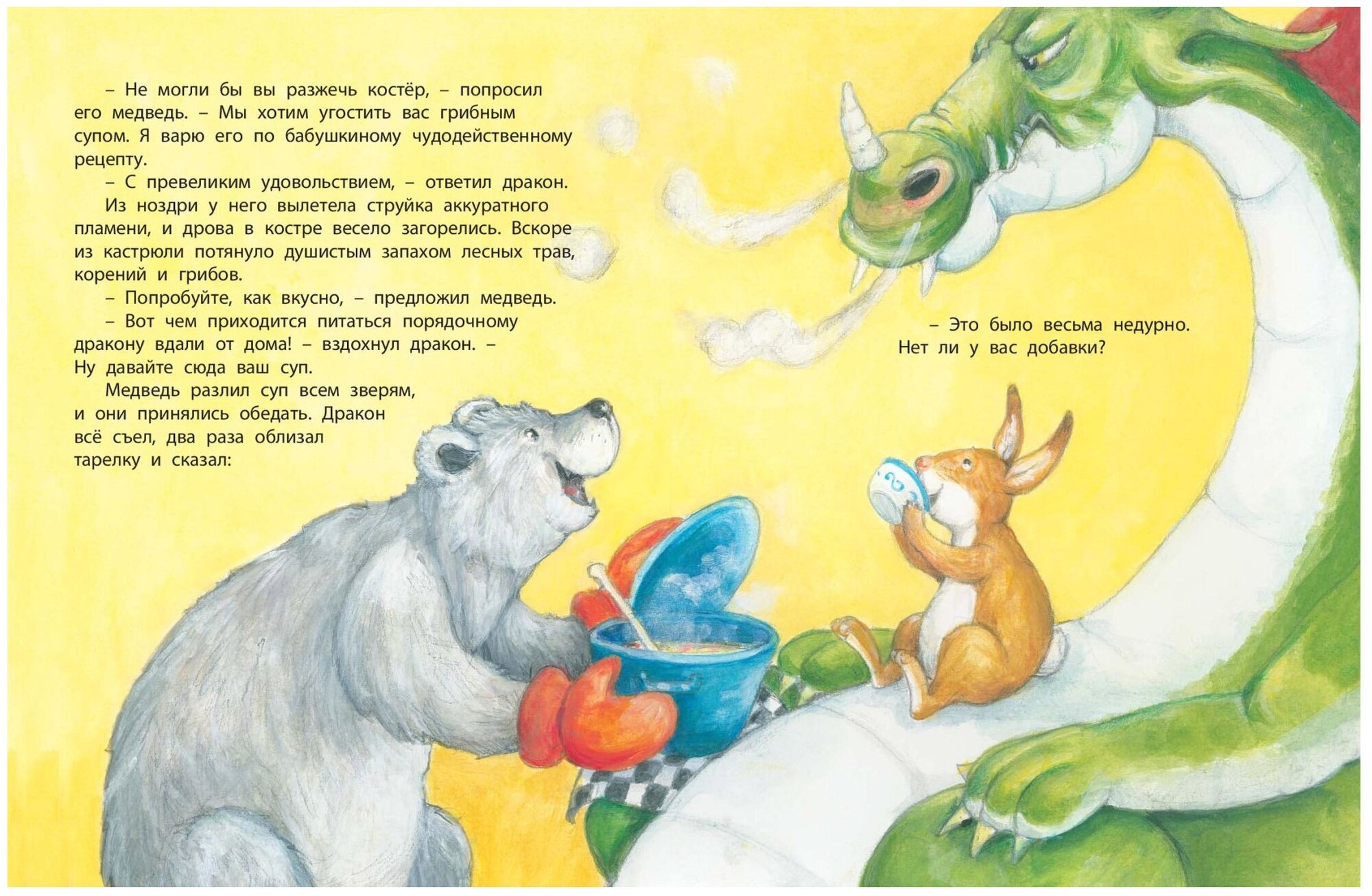 отличная книга. разделена на несколько глав. каждая глава - отдельная история о жителях лесу и дракона. история очень добрая. отдельно хочу отметить иллюстрации, можно долго рассматривать с ребёнком. художник постарался на славу. мы «проглотили» книгу за вечер. будем ее еще читать неоднократно