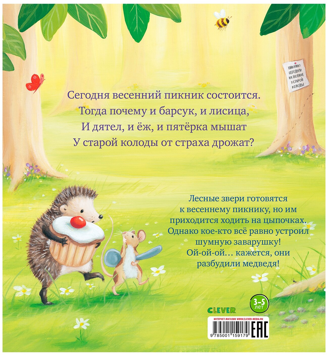 Clever Книга Чур, медведя не будить Смолмнен С. с очаровательными иллюстрациями поведает о трудностях зверей, которые собрались устроить пикник, но кое-что большое и страшное им мешает. Ни толком стол накрыть, ни потереть ушибленное место, ни повеселиться на славу зверята не могут — очень боятся потревожить медведя. Ведь разбуженный громила очень опасен! И все же никакие предосторожности не спасли друзей от пробуждения медведя. Что они ему скажут, чтобы успокоить, и чем закончится весенний пикник, вы узнаете только в конце книги Чур, медведя не будить! Особенности: Возраст 3–5 лет Книжка-картинка с веселыми стихотворениями Идеальная книга для первого самостоятельного чтения! Развивает: Речь Чтение Воображение Чувство юмора.