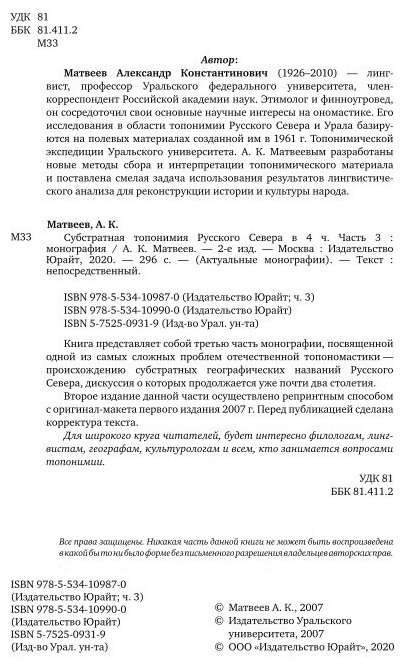 Книга представляет собой третью часть монографии, посвященной одной из самых сложных проблем отечественной топономастики — происхождению субстратных географических названий Русского Севера, дискуссия о которых продолжается уже почти два столетия..Второе издание данной части осуществлено репринтным способом с оригинал-макета первого издания 2007 г. Перед публикацией сделана корректура текста..Для широкого круга читателей, будет интересно филологам, лингвистам, географам, культурологам и всем, кто занимается вопросами топонимии..