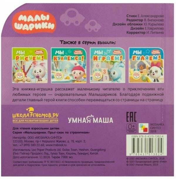 .Книга из серии «Малышарики. Прыг-скок по страничкам» изготовлена из плотного картона и имеет небольшой формат – ее удобно брать с собой повсюду: в поездку, поликлинику, гости и на прогулку.