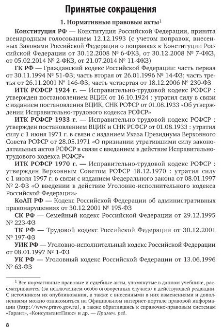 Учебник подготовлен в соответствии с положениями Уголовно-исполнительного кодекса РФ, действующими федеральными законами, международно-правовыми актами и типовой программой для юридических вузов. В нем подробно рассматриваются понятия, категории и институты Общей части уголовно-исполнительного права. Учтены все изменения, внесенные в УИК РФ и иные нормативные правовые акты, регламентирующие порядок и условия исполнения уголовных наказаний, а также новейшая научная, учебная и учебно-методическая литература по уголовно-исполнительному праву. В виде приложений даны Уголовно-исполнительные кодексы действующие до УИК РФ. Материал изложен в доступной для быстрого и эффективного усвоения учебного курса форме.
