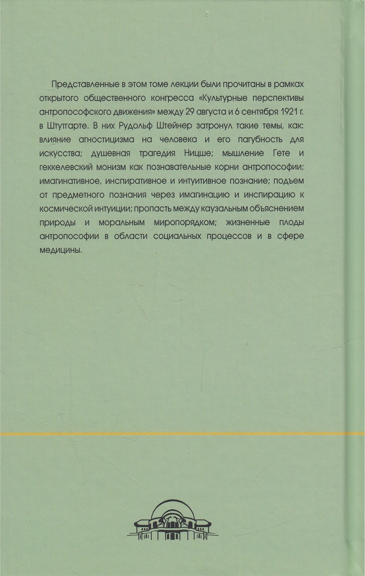 Представленные в этом томе лекции были прочитаны в рамках открытого общественного общественного конгресса "Культурные перспективы антропософского движения" между 29 августа и сентября 1921 г. в Штутгарте. В них Рудольф Штайнер затронул такие темы, как: влияние агностицизма на человека и его пагубность для искусства; душевная трагедия Ницше; мышление Гете и геккелевский монизм как познавательные корни антропософии; имагинативное, инспиративное и интуитивное познание; подъем от предметного познания через имагинацию и инспирацию к космической интуиции; пропасть между каузальным объяснением природы и моральным миропорядком; жизненные плоды антропософии в области социальных процессов и в сфере медицины. На русском языке том 78 из полного собрания сочинений Р. Штейнера публикуется впервые.