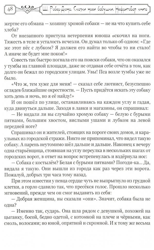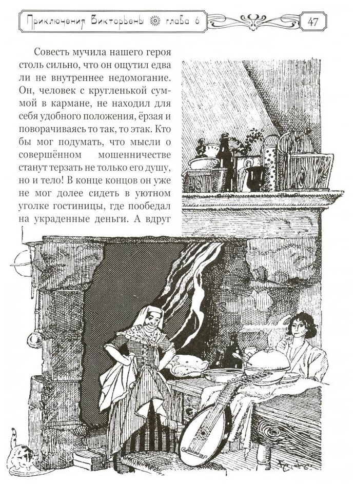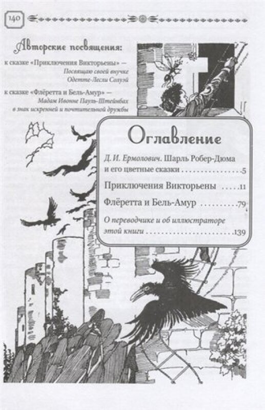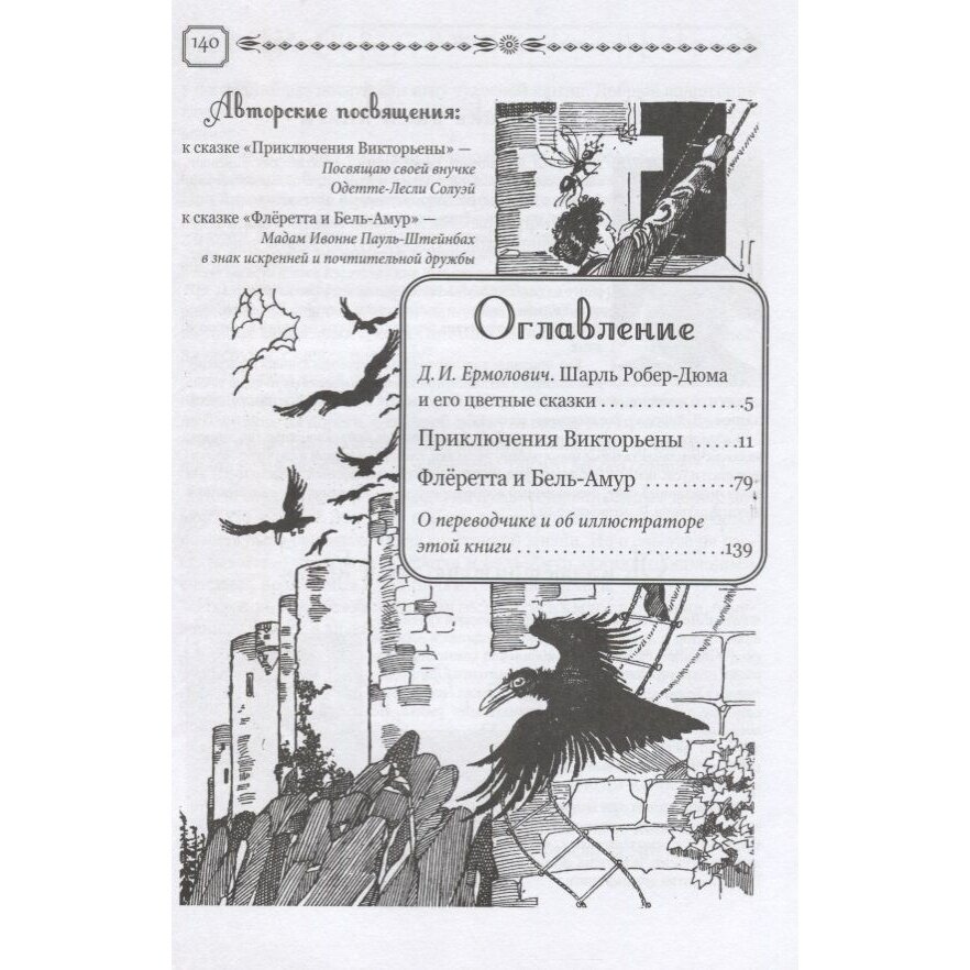 В очередную книгу "Сказок моей бабушки" вошли две сказочные повести - "Приключения Викторьены" и "Флёретта и Бель-Амур". Зачин первой очень напоминает историю того же автора "Хозяйка волков" - бедная падчерица, злая мачеха,верный друг-кот, скитания по городам. Но приключений и нелегких испытаний тут поменьше, и героиня быстро обретает свое счастье. Вторая история - о принце, чью любимую похитил злой колдун. Но доброе сердце помогло ему её найти. Сказки не то чтобы очень оригинальные, но что-то в них есть. Например, ирония. Вот что автор пишет про жадную принцессу - "Эту особу звали Женереза, или "Великодушная" Так в жизни бывает: имя звучит так. словно дано человеку в насмешку. На самом деле ей гораздо больше подошло бы имя Пиявка - настолько она любила сосать кровь из своего народа." Бумага в книге белая, шрифт удобный, много черно-белых картинок и несколько цветных на двусторонних вклейках..