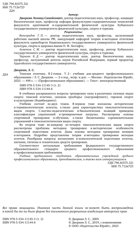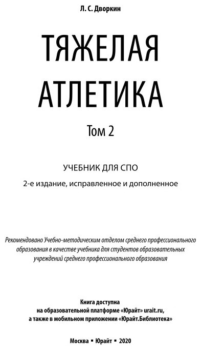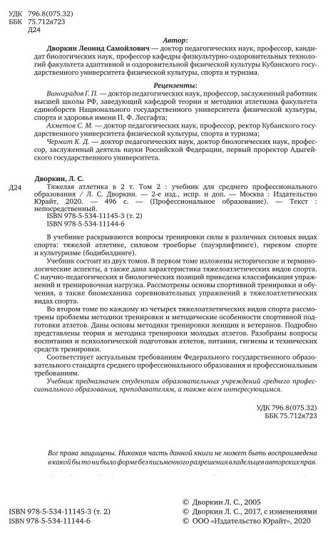 Тяжелая атлетика Том 2 Учебник (Леонид Самойлович Дворкин); ЮРАЙТ, 2019