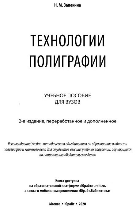 Книга: Технологии полиграфии (Наталья Михайловна Запекина); ЮРАЙТ, 2019