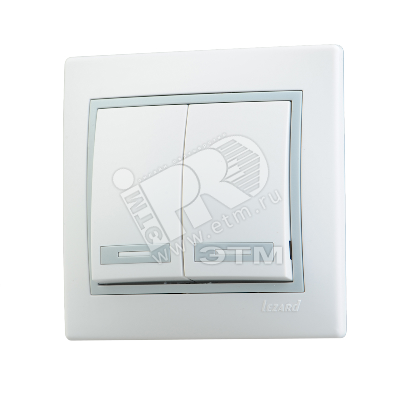 Выключатель 2-кл. СП Mira 10А IP20 с сер. вставкой бел. LEZARD • назначение Выключатель 2-клавишный это двухпозиционный коммутационный аппарат с замыкающими (нормально-разомкнутыми) контактами, предназначенный для работы в сетях с напряжением до 1000 вольт, не предназначенный для отключения токов короткого замыкания, без специальных устройств дугогашения, местного управления, с ручным приводом. • Область применения В основном применяются для включения и выключения освещения в бытовых и производственных условиях. • Принцип действия Принцип действия основан на коммутации контактов механическим способом (нажатием) , при этом положения коммутации фиксированы и позволяют находится в этом режиме достаточно долго, вплоть до следующего воздействия. • Дополнительные принадлежности ИЛИ аксессуары