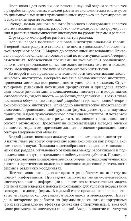 Монография описывает особенности моделирования экономических институтов на уровне фирмы и региона. Представлены основы институциональной теории, классификация экономических институтов, характеристика и оценка трансакционного сектора различных регионов. Отдельный раздел посвящен миниэкономическим интститутам, в частности институтам поиска информации, институтам управления оппортунизмом, институтам инвенций. Также рассмотрены мезоэкономические институты: сетевых организаций; общественного сектора экономики; виртуального рынка. Завершает монографию изложение теории институционального моделирования. Издание содержит богатый иллюстративный материал в виде графиков, схем и таблиц, краткие выводы к каждой главе.