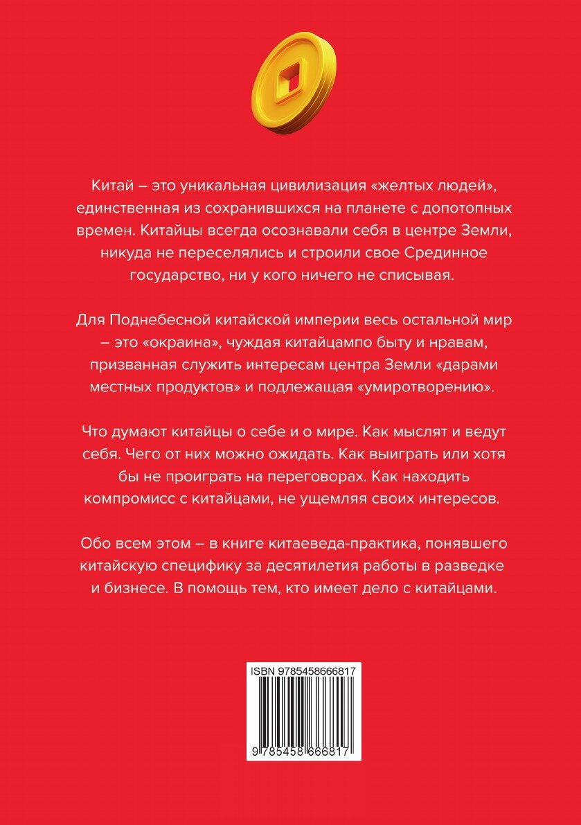 Китай – это уникальная цивилизация «желтых людей», единственная из сохранившихся на планете с допотопных времен. Китайцы всегда осознавали себя в центре Земли, никуда не переселялись и строили свое Срединное государство, ни у кого ничего не списывая. Для Поднебесной китайской империи весь остальной мир – это «окраина», чуждая китайцампо быту и нравам, призванная служить интересам центра Земли «дарами местных продуктов» и подлежащая «умиротворению». Что думают китайцы о себе и о мире. Как мыслят и ведут себя. Чего от них можно ожидать. Как выиграть или хотя бы не проиграть на переговорах. Как находить компромисс с китайцами, не ущемляя своих интересов. Обо всем этом – в книге китаеведа-практика, понявшего китайскую специфику за десятилетия работы в разведке и бизнесе. В помощь тем, кто имеет дело с китайцами.