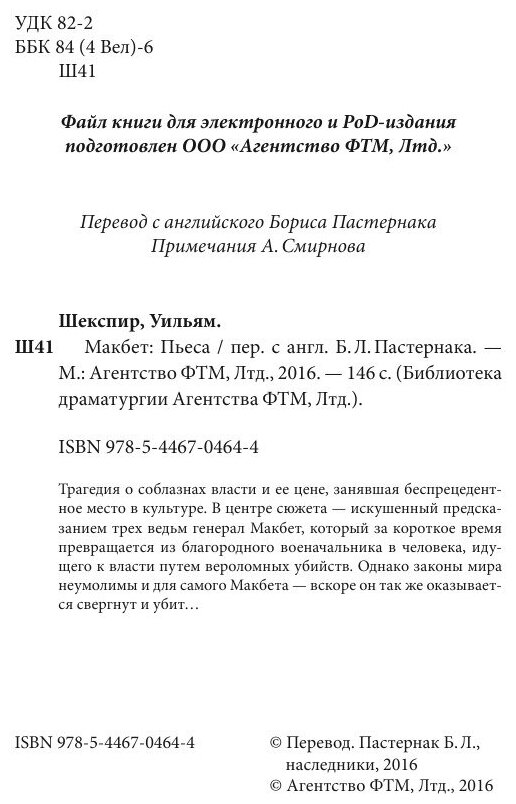 На сегодняшний день товар «Книга: Макбет (Уильям Шекспир); ФТМ, 1623» можно купить с кешбеком в 1 магазине: ЛитРес