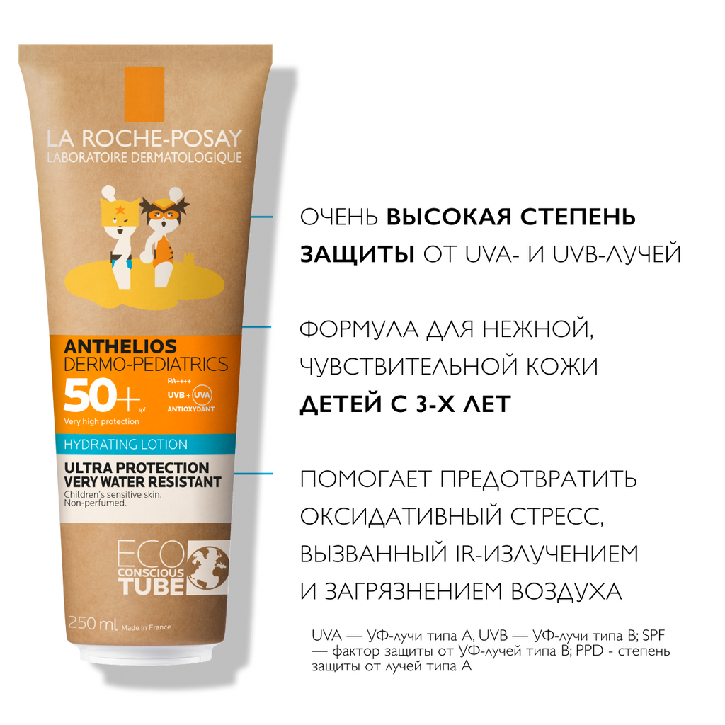Молочко La Roche-Posay Дермо Кидс отвечает более строгим требованиям, чем Европейский стандарт, для предупреждения негативного воздействия UVA лучей на кожу. Содержит термальную воду Ля Рош Позе, богатую селеном, природным антиоксидантом. Формула разработана с применением ингредиентов, тщательно отобранных для полной безопасности кожи младенцев. Обогащена натуральным экстрактом масла карите для увлажнения, смягчения и усиления естественного защитного барьера кожи. Мягкая и бархатистая текстура.
