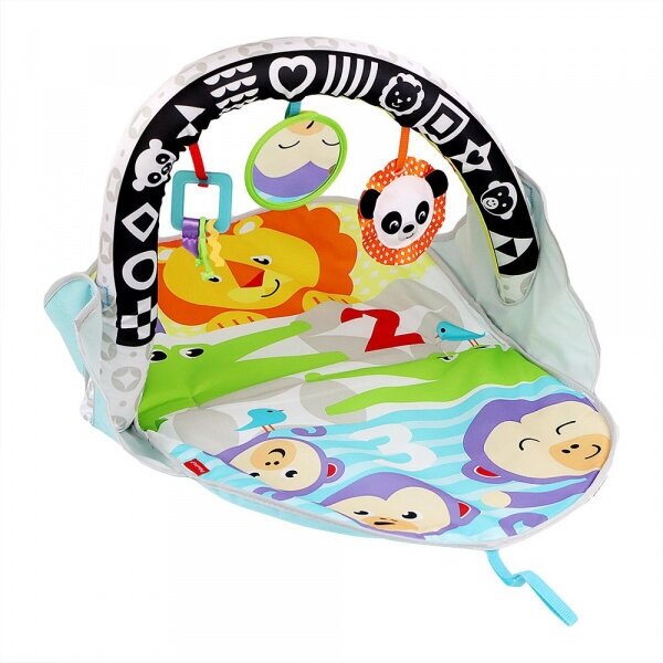Развивающий коврик от Fisher Price предназначается для раннего развития основных навыков ребенка в первые месяцы его жизни. Коврик отличается мягкой поверхностью и красочной расцветкой. На его дуге располагаются три яркие развивающие игрушки – погремушка в виде панды, тактильная игрушка и небольшое безопасное зеркальце. Коврик возможно использовать 2-мя способами. Поднимите дугу, положите малыша на спинку и он будет рассматривать и трогать ручками подвешенные игрушки. Если ребенок уже умеет держать голову и привставать на руках, то опустите дугу и положите малыша на животик. Он сможет изучать развивающие игрушки, лежа на животе. Коврик поможет ребенку развиваться и познавать окружающий мир.