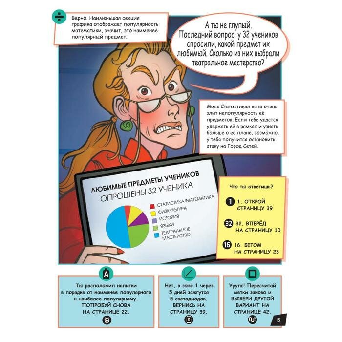 "Хакерская атака" расскажет об опасном вирусе, который вот-вот уничтожит школьную компьютерную систему. Читателю придётся сразиться с ним, а в процессе познакомиться с интереснейшим миром статистики и решить множество задач. Книга сама направит героя на нужную страницу в соответствии со сделанным им выбором. Правильный ответ позволит продвинуться дальше по сюжету, а ошибка перенесёт на предыдущую страницу, где можно будет попытаться ещё раз. Приключение на каждой странице!