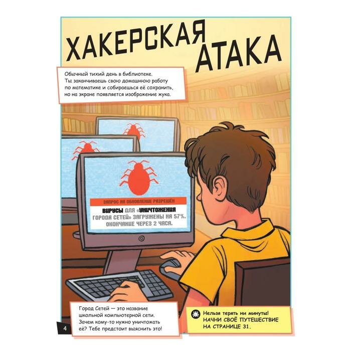 Хакерская атака. Желтая книга — самая смешная из серии. В ней есть компьютерные мокрицы, которых нужно перезапустить, тараканы, от которых приходится прятаться за дверью, оса, которая пытается сбросить тебя со своей спины и злобная учительница математики. Все события книги происходят в компьютерной сети, в которую читатели попадают через портал. В ходе приключений юные читатели знакомятся с азами математической статистики (в этом, кстати, им способен помочь словарь, размещенный в конце книги), а также учатся легко и непринужденно разбираться со всевозможными графиками и диаграммами.