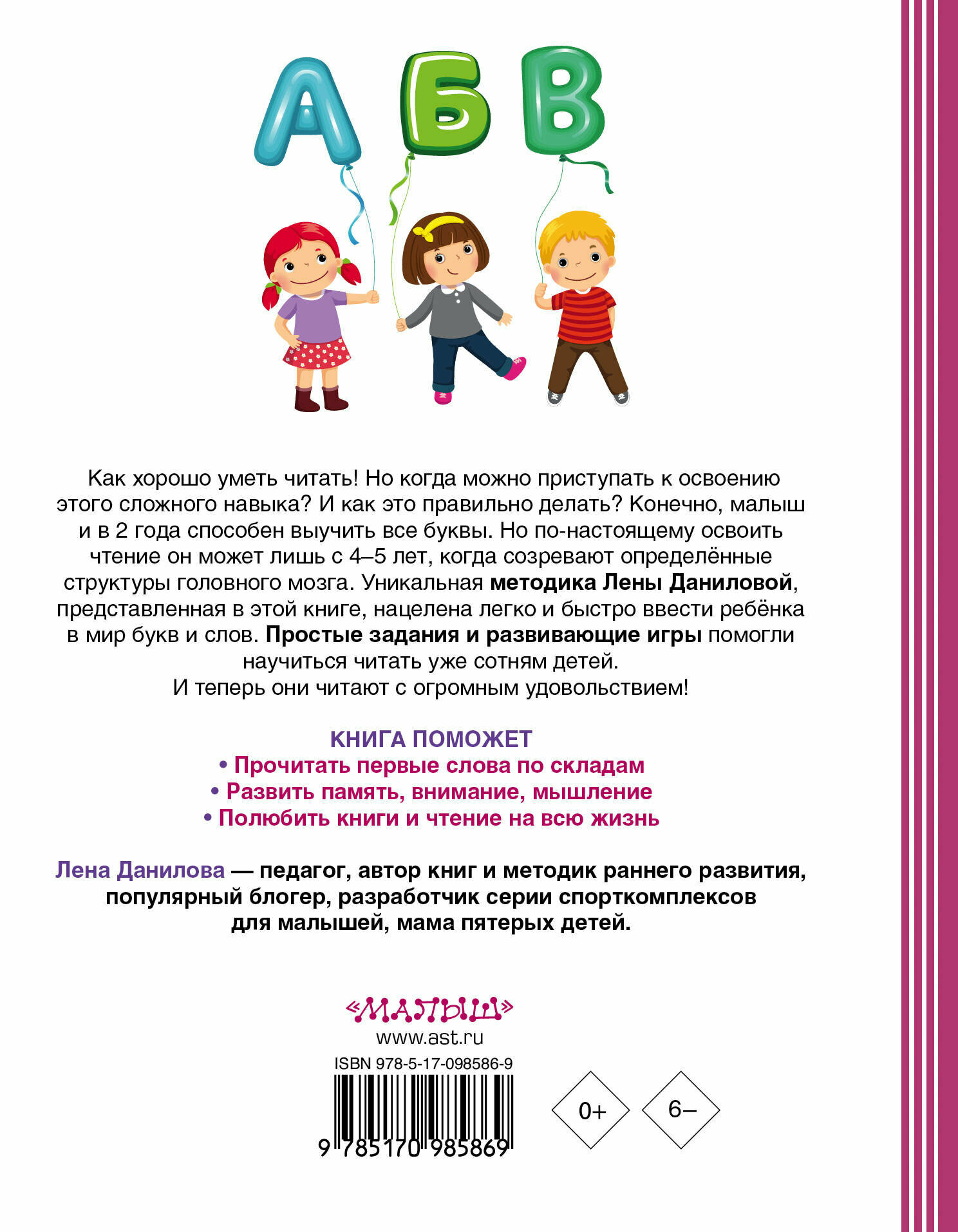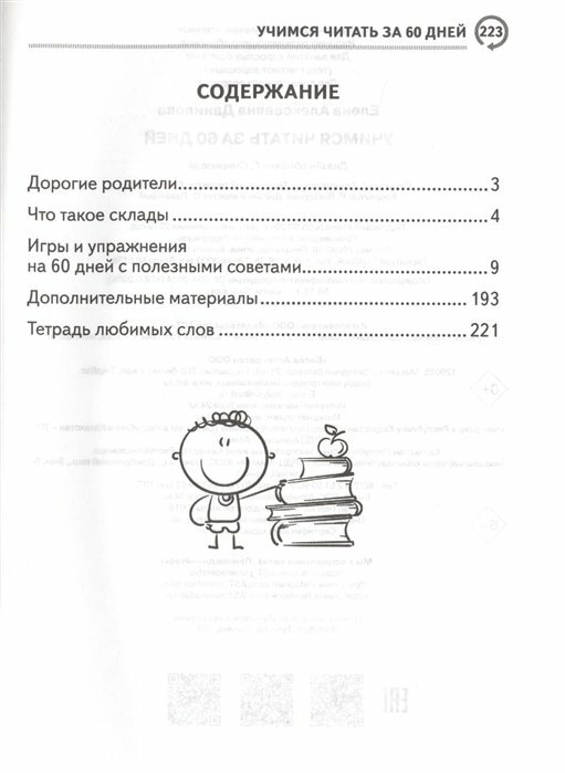 C Леной Даниловой и ее сайтом знакома с 2013,как появился старший.Многие ее высказывания или опыт изменили мой взгляд на воспитание и развитие детей.Сейчас старший учится читать,Как только увидела эту книгу-сразу заказала.Книга построена очень конкретно,никакой воды,только подробные занятия на 60 дней.Все занятия очень просты и гениальны.Мы только начали заниматься,но ребенку очень нравится.В книжке можно выполнять задание,дополнительные материалы есть в конце книжки.Эти занятия действительно интересны ребенку,потому что мы с ним играем!А читать само собой получается)))Единственный минус,который я увидела-что склады не цветные,у Лены на презентациях всегда выделены цветом,это больше к издательству претензия.Так что если ваш ребенок учится читать-смело берите эту книжку и дело пойдет семимильными шагами!