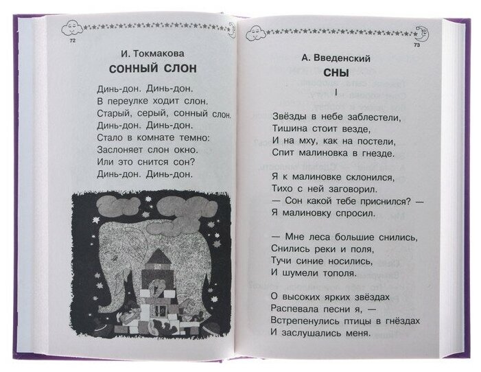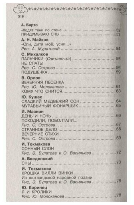 Это одна из первых книг, которые я купила своему ребенку. Она заняла достойное место в моей пока ещё небольшой детской библиотеке во многом благодаря своему богатому содержанию. Чего только нет в этом сборнике: стихи, сказки, колыбельные,песенки из известных мультфильмов. Я читала их не только на ночь, но и всякий раз, когда ребенок просил почитать книжку. Рекомендую!