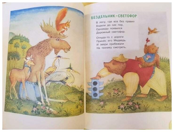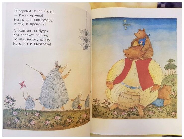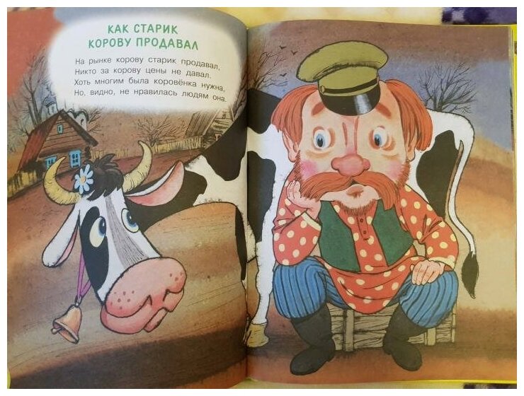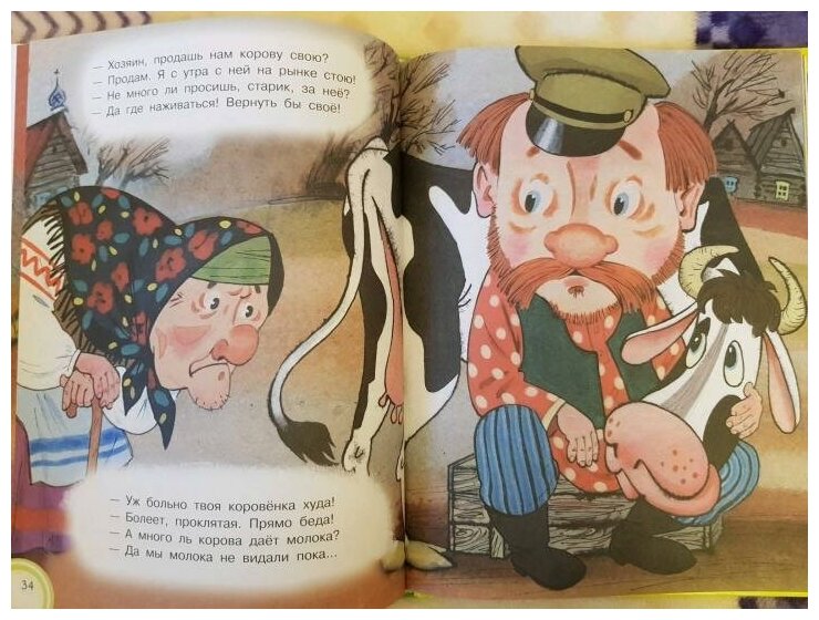 Книжка большая по формату (как лист А4), страницы плотные. Содержит следующие сказки в стихах: "про Лягушонка", "Бездельник- светофор", "Как мужик корову продавал", " Мороз и морозец". А также сказку "Три поросенка" в прозе. Очень много ярких и крупных иллюстраций на каждой странице, которые нравятся ребëнку!