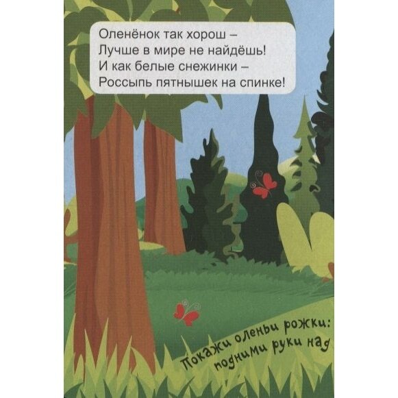 Плотные картонные страницы делают эту книжечку более "выносливой". Очень порадовали иллюстрации реалистичные животные-детишки, правда фон простоватый, необычная идея встроить в фон текст с заданиями и подсказками к малышу, что помогает вести обучающий иллюстрированный диалог.