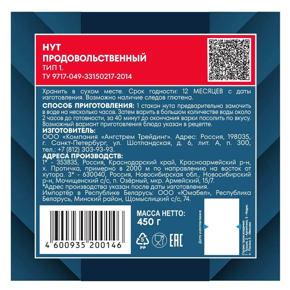 Состав товара:Нут продовольственный.Способ приготовления:1 стакан нута предварительно замочить в воде на несколько часов. Затем варить в большом количестве воды около 2 часов до готовности, за 40 минут до окончания варки посолить по вкусу.