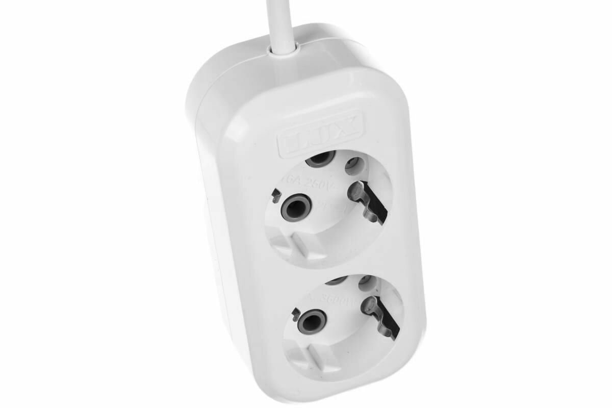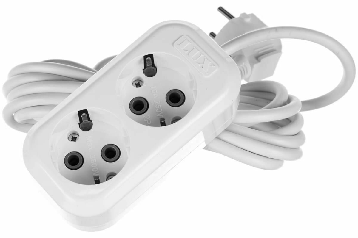 Двухместный сетевой удлинитель LUX У2-Е-03 - удобен при работе с двумя электроприборами или инструментами одновременно. Максимальная совокупная мощность приборов, подключенных к удлинителю, не может превышать 3600 Вт. Устройство оборудовано проводом ПВС, состоящим из скрученных между собой медных жил малого и среднего сечения с изоляцией, снаружи защищенной оболочкой из ПВХ. Длина провода удлинителя составляет 3 метра.