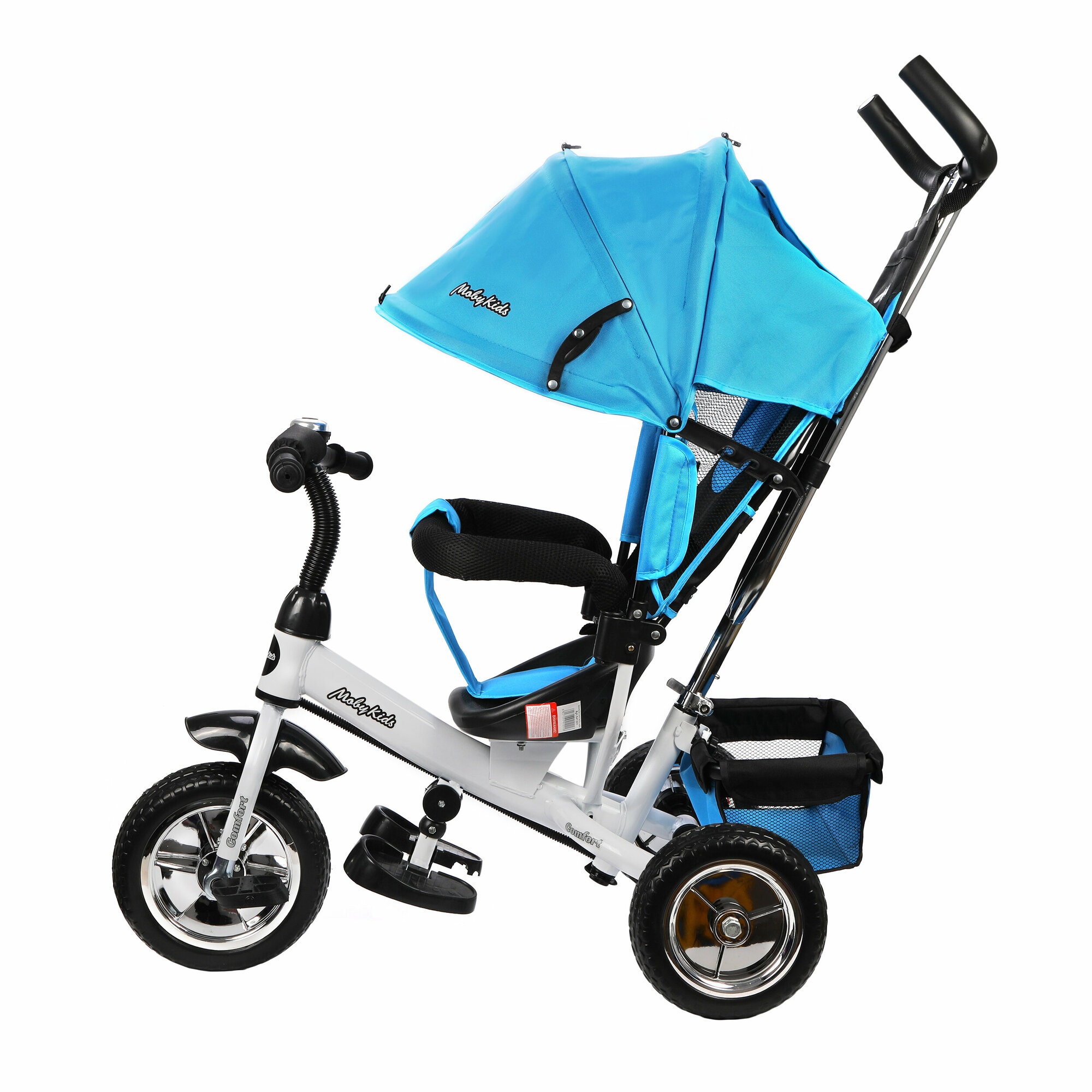Детский трёхколёсный велосипед Moby Kids Comfort 10х8 EVA. В данной модели предусмотрены дополнительные функции, которые сделают прогулку малыша и его родителей максимально комфортной. Характеристики:металлическая рама, колеса из EVA: диаметр переднего колеса - 25 см, диаметр задних колес - 20 см, двойная телескопическая ручка-толкатель с сумочкой фиксируется в двух положениях (выше-ниже),мягкий вкладыш-«кенгуру» на сидении, сиденье с высокой спинкой фиксируется в трех положениях, съемный мягкий подголовник,складной тент колясочного типа с фиксаторами положения, ножной тормоз,съемная раздвижная дуга безопасности с мягкими подлокотниками, ремень безопасности, звонок и красочная вертушка «ветерок» на руле,складные подставки для ног,тканевая багажная корзина на металлическом каркасе.