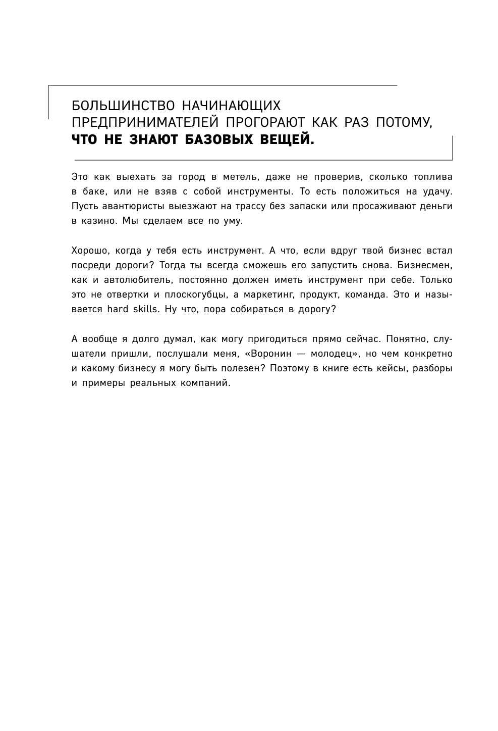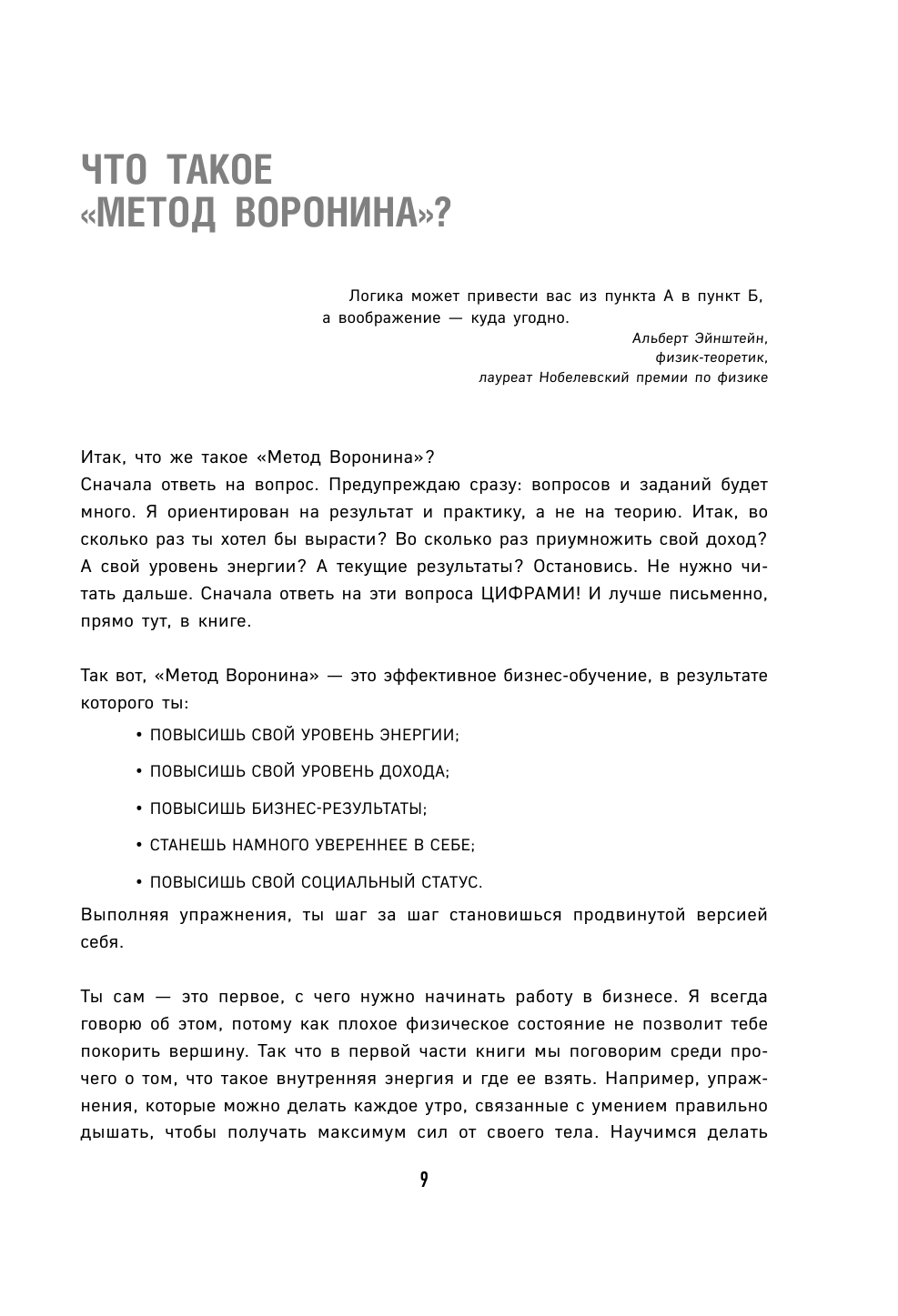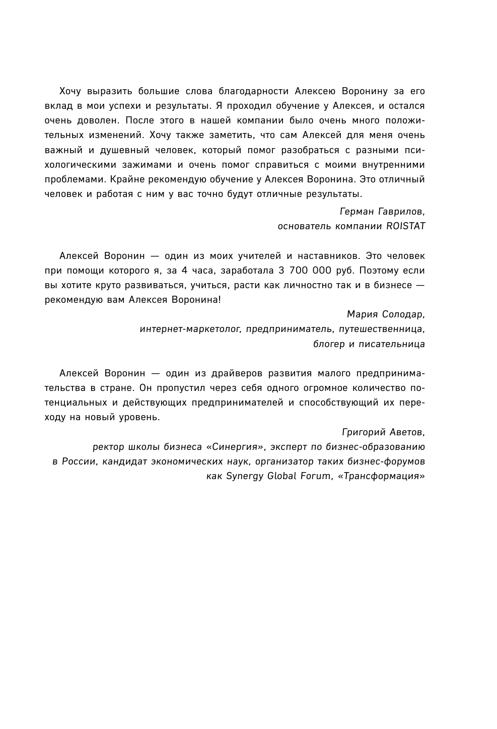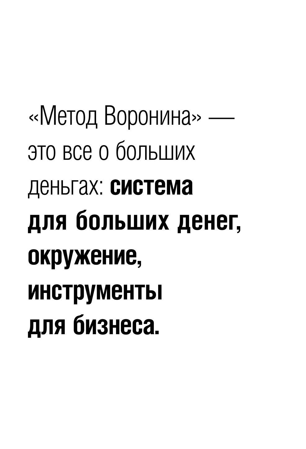 Принцип, который лежит в основе книги - "Метод Воронина". Бизнес-обучение, основанное на 20-летнем опыте автора и кейсах его учеников. Среди тех, кто прошел обучение у Алексея известные российские предприниматели: Михаил Кучмент (Hoff), Григорий Аветов ("Синергия"), Дмитрий Ковпак и многие другие. Здесь будет пошагово рассказано, что такое масштабирование бизнеса, как сохранить время и деньги, и что нужно сделать, чтобы выйти на следующий уровень дохода.