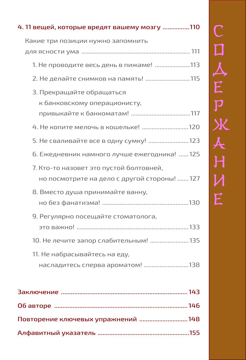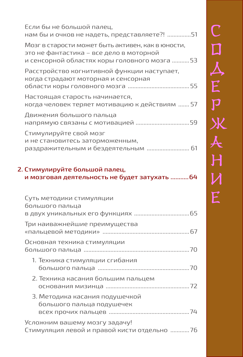 В книге подробно обсуждается так называемая "пальцевая методика", ставшая настоящей сенсацией в современной Японии. Ваши пальцы - в частности, большие пальцы рук - оказываются чем-то наподобие еще одного головного мозга, а ведь давно уже замечено, что мелкая моторика способствует остроте ума вплоть до глубокой старости. Но как правильно задействовать наши пальцы?