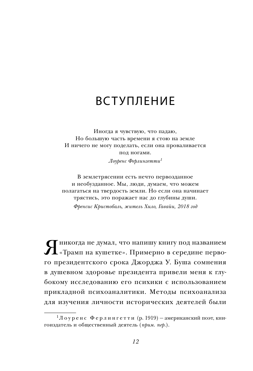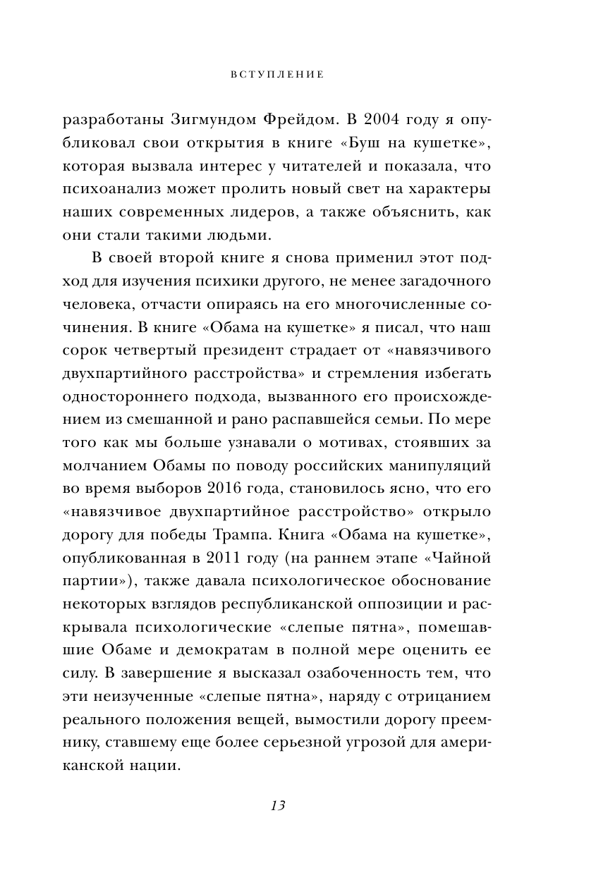 Еще ни один президент США не подвергался более оживленному обсуждению, чем Дональд Трамп. Он ведет себя эксцентрично и вызывающе, как будто одновременно стучится в окно, колотит в дверь, звонит по телефону и пишет бесчисленные посты в Twitter, постоянно требуя внимания к своей персоне. Заглянуть во внутренний мир Трампа и найти причины его странного поведения попытался Джастин Франк, психоаналитик и профессор психиатрии. Безусловно, Трамп на его кушетке никогда не был, книга основана на биографии, словах и поступках президента. Но даже эти ресурсы дают настолько яркий материал для психоанализа, что выявляют наиболее важные источники и движущие силы, раскрывающие психологию его личности.