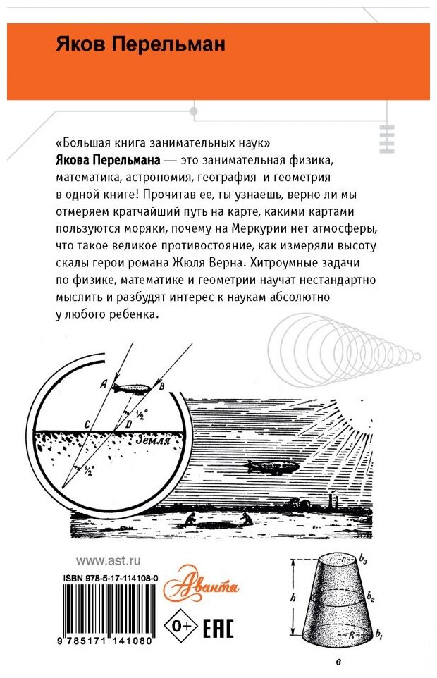 "Большая книга занимательных наук" Якова Перельмана - это занимательная физика, математика, астрономия, география и геометрия в одной книге! Прочитав ее, ты узнаешь, верно ли мы отмеряем кратчайший путь на карте, какими картами пользуются моряки, почему на Меркурии нет атмосферы, что такое великое противостояние, как измеряли высоту скалы герои романа Жюля Верна. Хитроумные задачи по физике, математике и геометрии научат нестандартно мыслить и разбудят интерес к наукам абсолютно у любого ребенка. Для среднего школьного возраста.