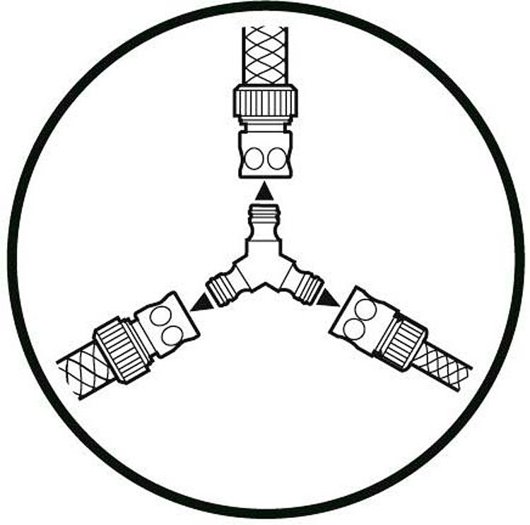 Тройник для шланга Gardena предназначен для соединения одновременно трех шлангов, позволяя таким образом значительно увеличить площадь поливаемой почвы, разделяя линию на две.