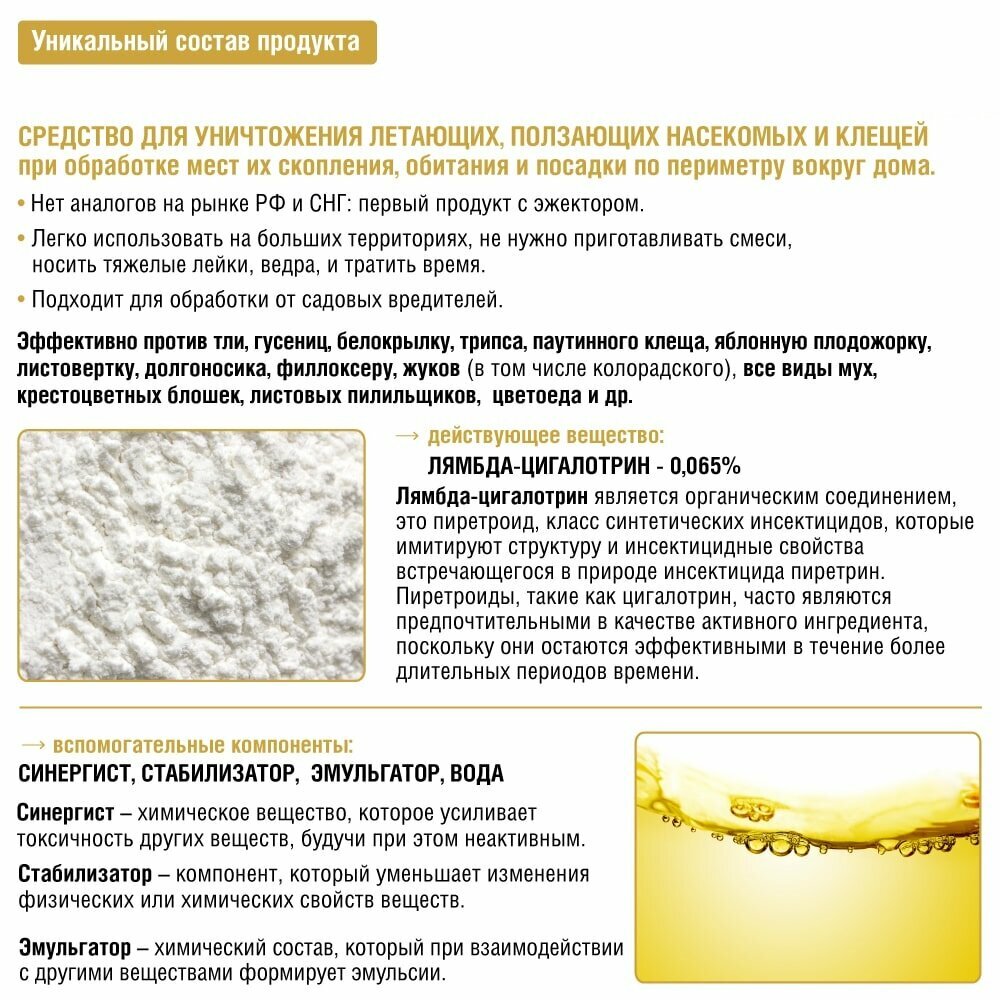 | Состав | ДВ-лямбда-цигалотрин (0,065%), синергист, стабилизатор, эмульгатор, вода |
