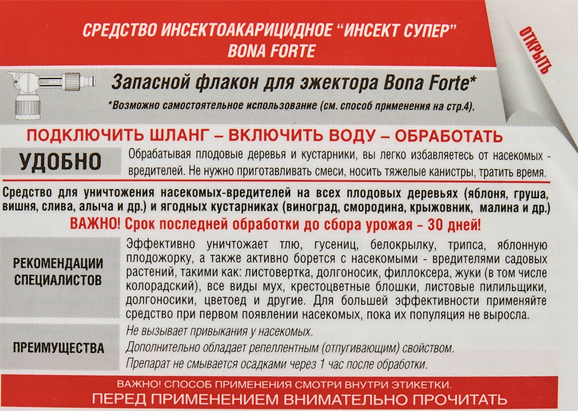 Средство для обработки плодовых деревьев и ягодных кустарников от тли , гусениц, белокрылки, трипса, яблонной плодожорки. А также эффективно против таких насекомых - вредителей садовых растений, как: листовертка, жуки (в том числе колорадский), все виды мух, крестоцветные блошки, листовые пилильщики, долгоносики, цветоед, паутинный клещ.