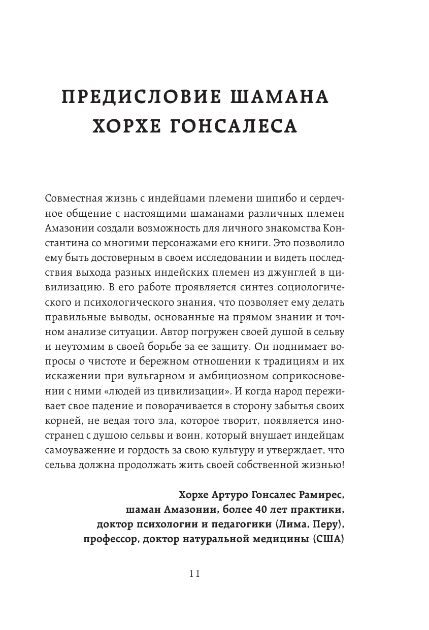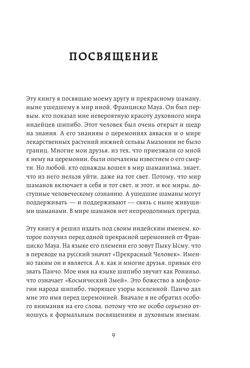 Книга читается на одном дыхании! Очень лёгкий, приятный стиль, не отягощенный длинными теоретическими размышлениями, как это иногда бывает в данной теме. Константин рассказывает о том, что знает и через что прошел, как-будто разговаривая с читателями. Очень восхищает открытость и доверие автора, который откровенно делится глубинными переживаниями и сомнениями, при этом не погружаясь полностью в мистическое мышление, а придерживаясь, по-возможности, научной точки зрения. Порадовало подробное сравнение свойств растительного напитка с последствиям употребления химических веществ. Это важно! Помимо увлекательнейшего содержания книги, очень впечатляет тепло, свет и добро, которые несёт автор. Спасибо Константину Рониньо за уникальное произведение.