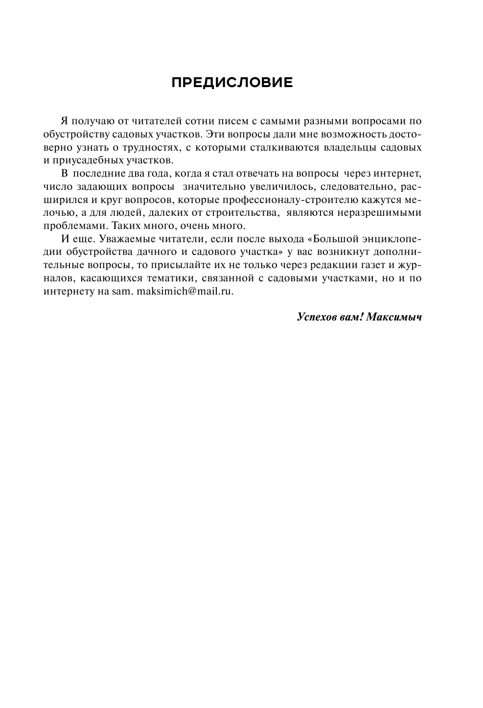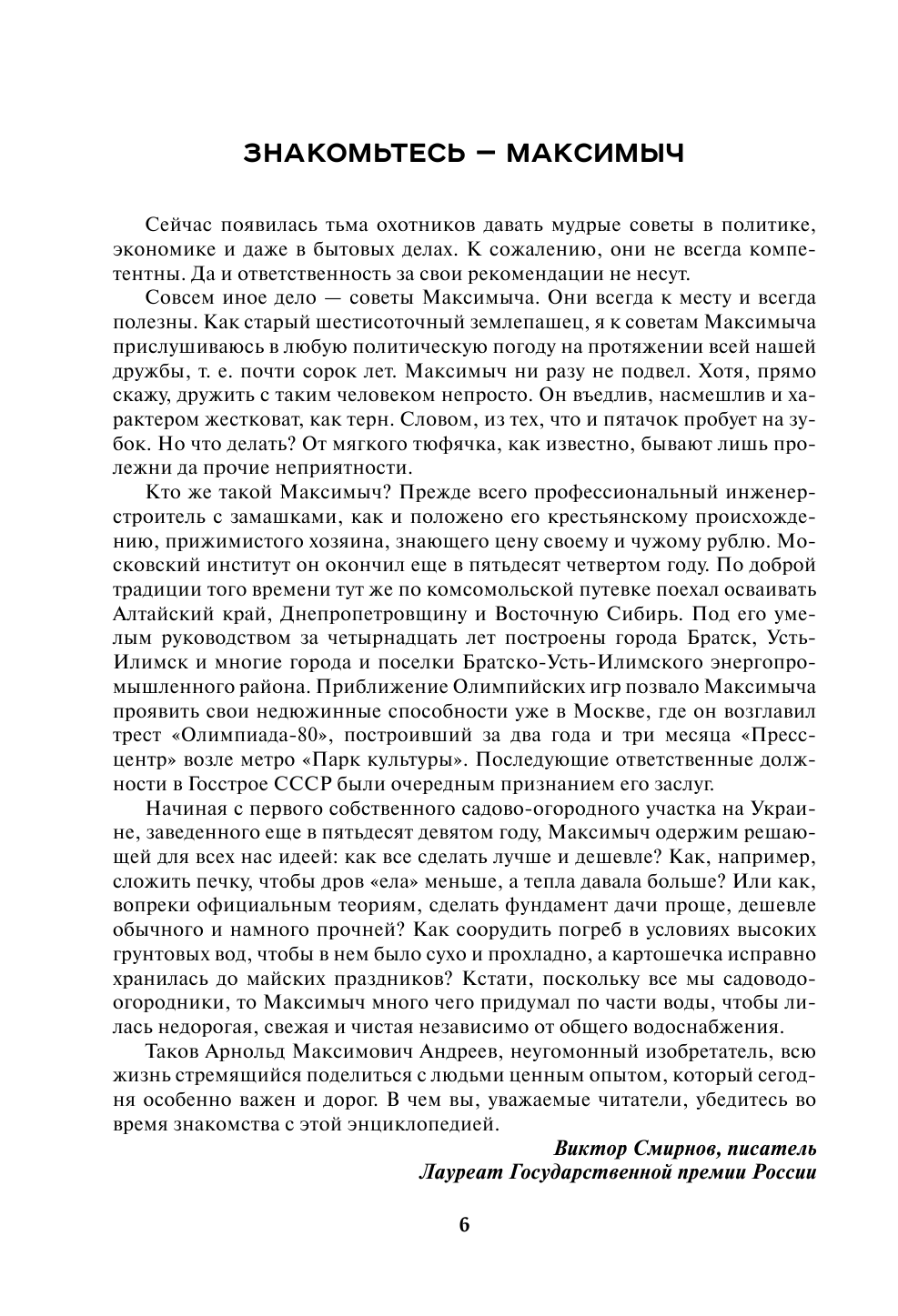 Эта энциклопедия - незаменимый помощник для тех, кто только начинает осваивать собственный участок и мечтает с нуля обустроить его своими руками. Арнольд Максимович Андреев, или просто Максимыч, - инженер-строитель с 50-летним опытом, рачительный хозяин, освоивший не один участок в самых разных районах нашей страны. Его советы - это сборник подробных инструкций, чертежей и расчетов, которые помогут читателю правильно спланировать участок, построить дом, благоустроить территорию и возвести самостоятельно теплицу, баню или хозблок.