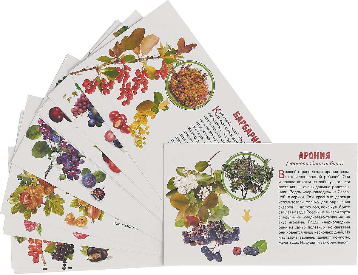 Комплект "Садовые ягоды" познакомит детей с ягодами, которые растут в садах россиян, реалистичные картинки напомнят детям, как выглядят ягоды, а из текста они узнают об особенностях этих растений и о том, как их используют люди.