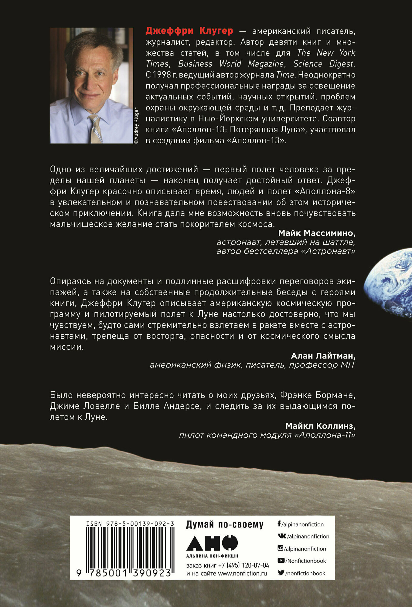 В августе 1968 г. НАСА приняло смелое решение: запустить первый обитаемый космический корабль к Луне. Всего год назад три астронавта погибли в пожаре во время испытаний, и с тех пор программа «Аполлон» терпела одну неудачу за другой. Тем временем СССР выигрывал космическую гонку, холодная война становилась все жарче с каждым месяцем, и обещание президента Кеннеди отправить человека на Луну к концу десятилетия казалось несостоятельным. Но когда Фрэнка Бормана вызвали на секретную встречу и предложили его экипажу опасную миссию, он без колебаний согласился. Эта книга — первая подробная история «Аполлона-8». Джеффри Клугер предлагает читателю захватывающую историю о миссии, которая была столь рискованной, что воспринималась почти как лотерея, но, увенчавшись успехом, ознаменовала начало новой эры в освоении космического пространства.