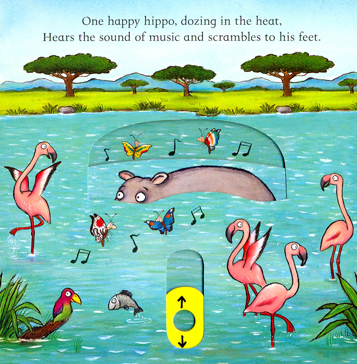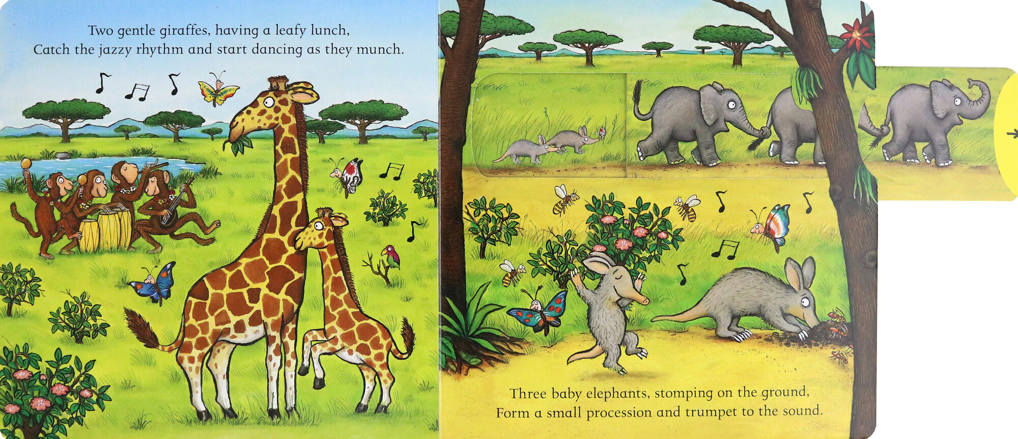 Little ones can join in the fun In the Jungle by pulling out the sliders, pushing up the tabs and counting all the animals! How many lazy lions are yawning? How many zebras are skipping?