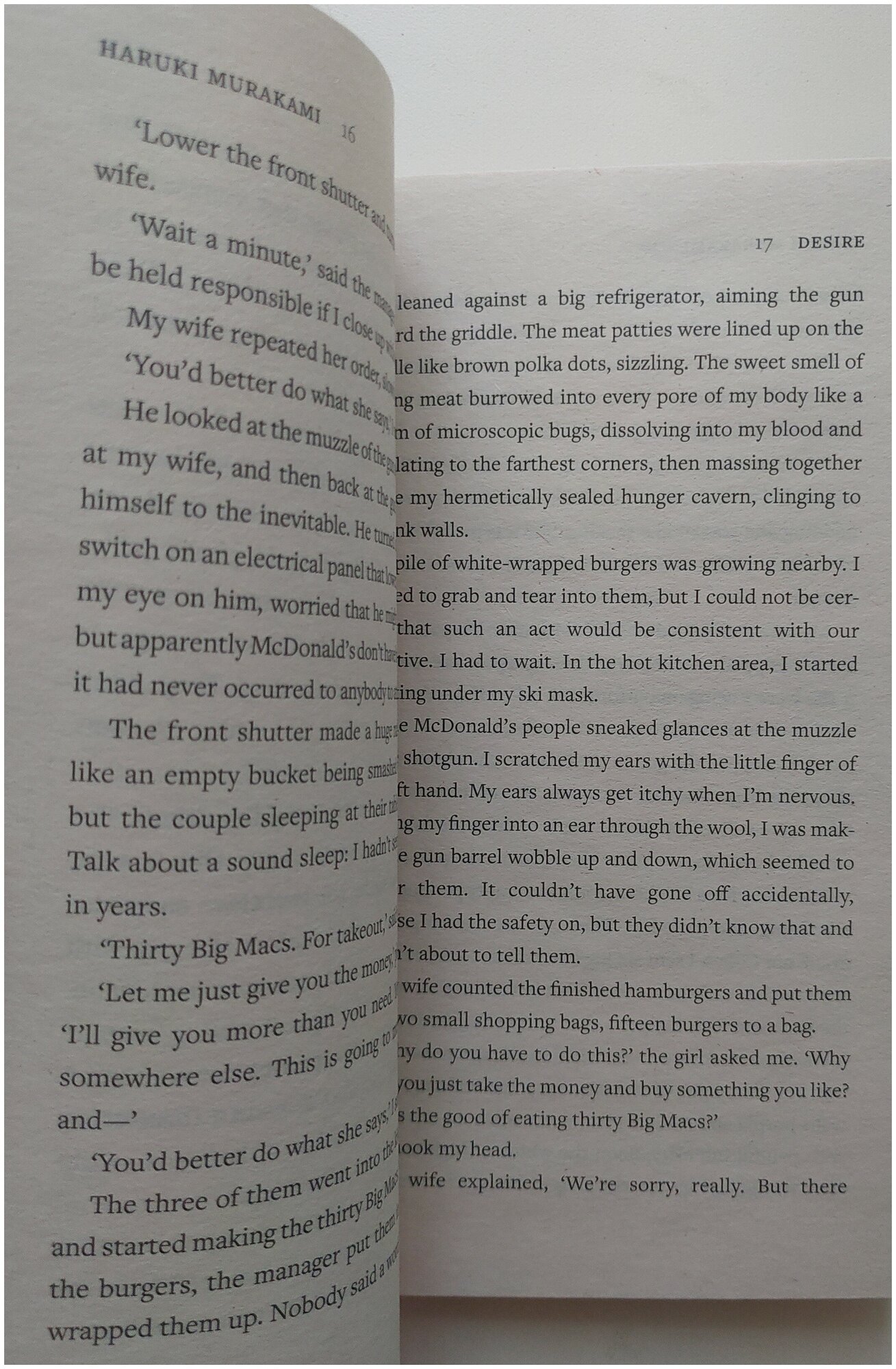 Совсем небольшая книжечка-сборник рассказов. Обложка очень приятная на ощупь, использована бумага одностороний Touch Cover. Это добавляет еще больше атмосферы к и так очень атмосферному Мураками. В книгу вошли следующие произведения: "The Second Bakery Attack", "On seeing the 100% Perfect Girl One Beautifiul April Morning","Birthday Girl", "Samsa in Love", "A Folklore for My Generation: A Prehistory of Late - Stage Capitalism" и краткая ,на страничку, биография автора.