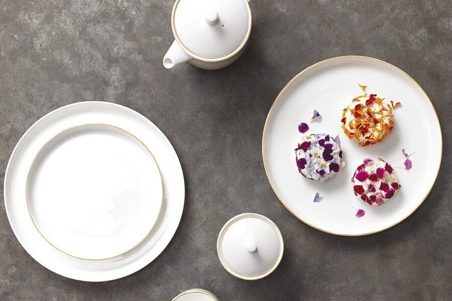 Коллекция "Кашемир Голд" - роскошь белоснежного костяного фарфора ультрамодной современной формы с золотой полосой по краю.