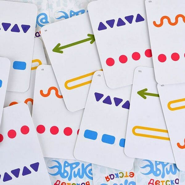 Карты с изображениями черно-белых фигурок и цветными символами.