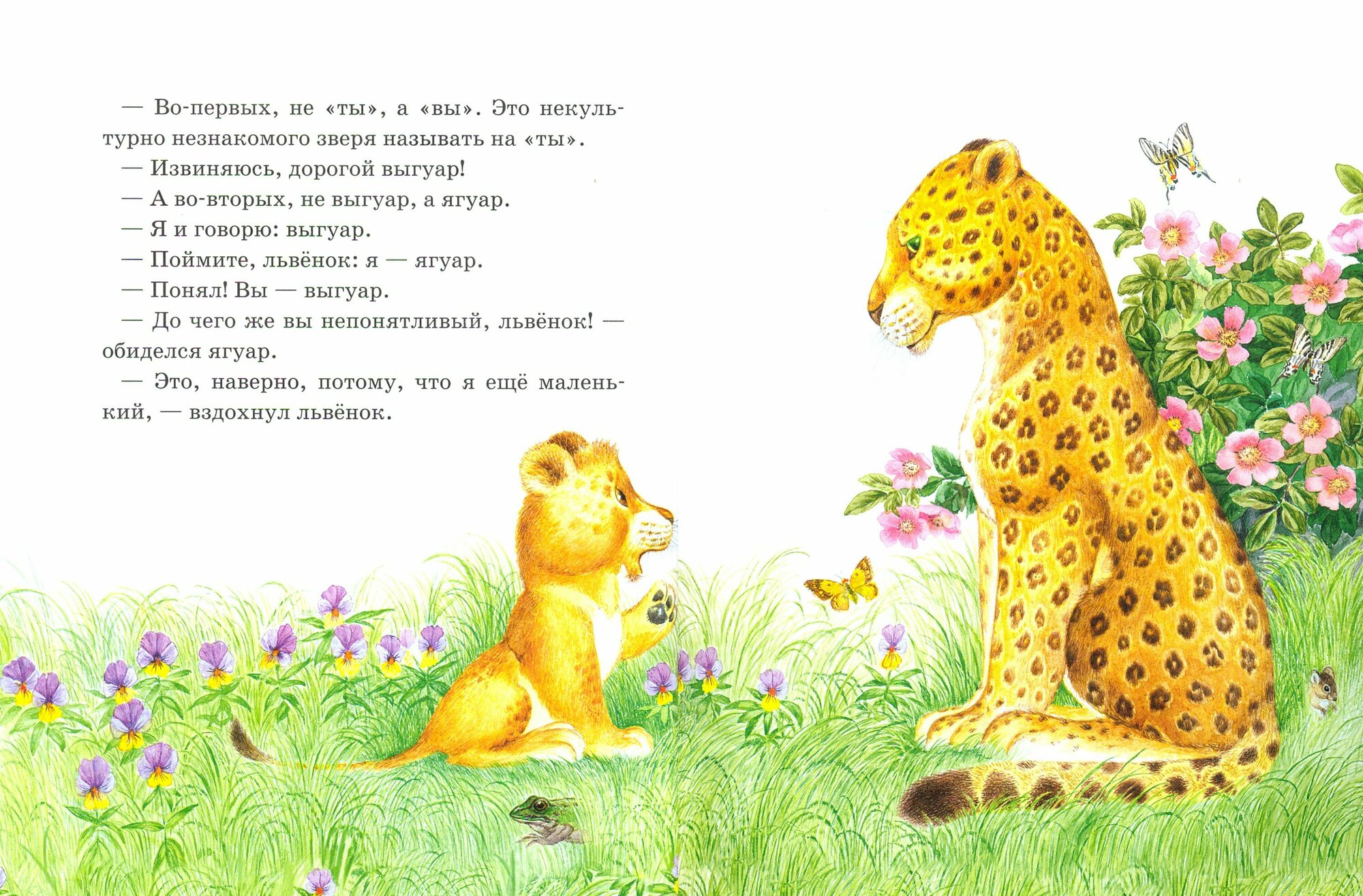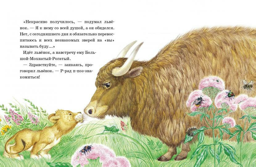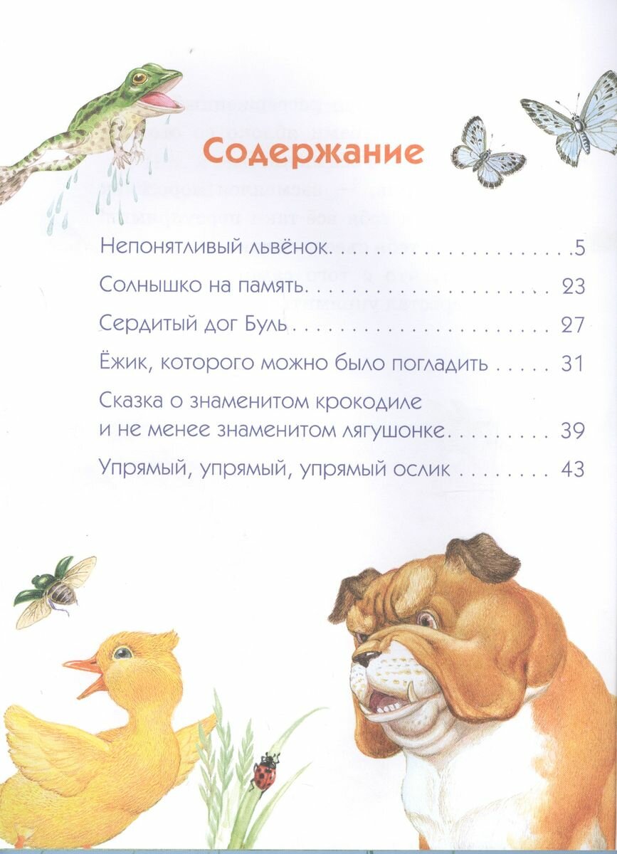 Внутри смешные и очень нежные истории о львёнке, который так и не понял разницу между "вы" и "я", о козлике, которому подарили солнышко на память, о сердитом дог Буле и хвастливом крокодиле, а также об упрямом-упрямом ослике и ёжике, которого никто не гладил.