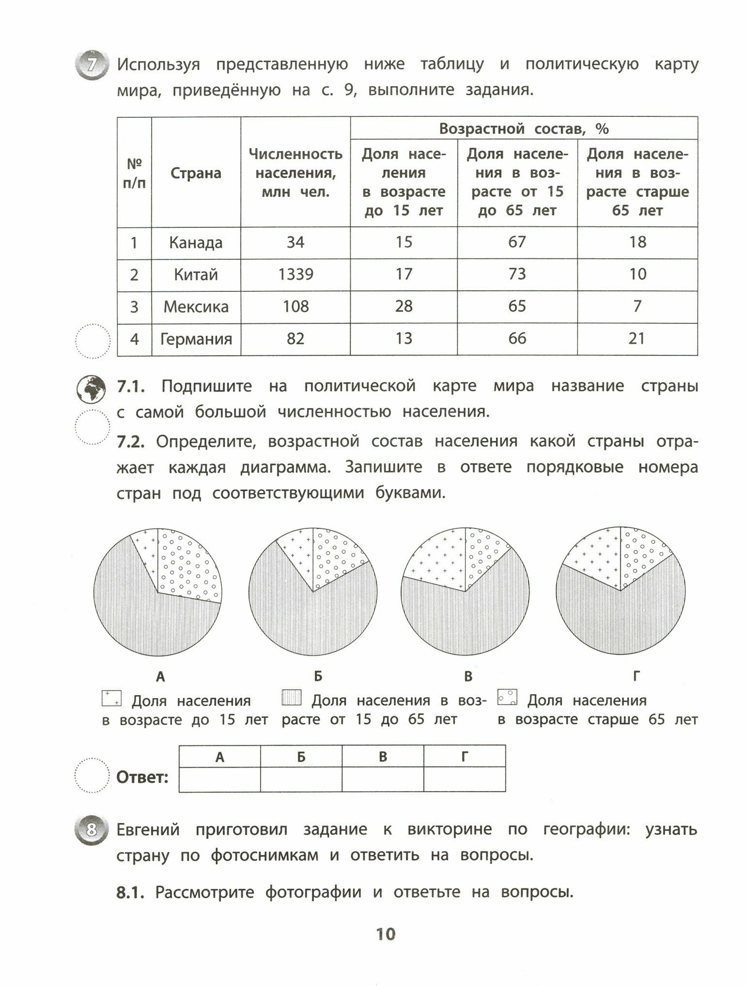 Рабочая тетрадь предназначена для подготовки семиклассников к успешному выполнению Всероссийской проверочной работы по географии, которая проводится в конце учебного года. Издание содержит 5 вариантов проверочных работ, соответствующих по структуре и типу заданий демоверсии ВПР, размещенной на официальном сайте . Каждая работа включает 8 заданий из различных тем курса географии 7 класса. Работать в тетради дети могут как в классе под руководством учителя, так и дома под контролем родителей. В конце пособия приведены ответы на задания. Материалы тетради также помогут семиклассникам успешно подготовиться к выполнению различных итоговых работ по предмету "География". Тетрадь разработана в соответствии с требованиями ФГОС основного общего образования к уровню подготовки учащихся по географии и может использоваться с любыми учебно-методическими комплектами.