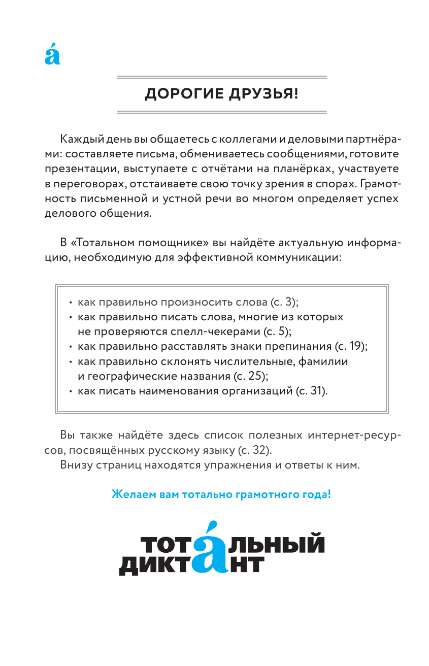 Слышали ли вы анекдот про человека, оказавшегося на необитаемом острове? В отчаянии он бросает в море бутылку с запиской: "Помогите выбратся!" Через год бутылка возвращается, а в ней записка: "Ться!" И действительно, в современном мире никуда без грамотной устной и письменной речи, ведь встречают теперь не только по одежке, но и по тому, как человек говорит и пишет. "Тотальный помощник" пригодится вам и на необитаемом острове, и в офисе бизнес-центра. Он напомнит, как правильно произносить слова, поможет разобраться в тонкостях склонения числительных, фамилий и географических названий, научит верно расставлять знаки препинания, расскажет, как писать новейшие слова, совсем недавно пришедшие в русский язык. А еще на страницах "Тотального помощника" вы найдете упражнения и ключи для самопроверки. Успехов вам! И до встречи на Тотальном диктанте!