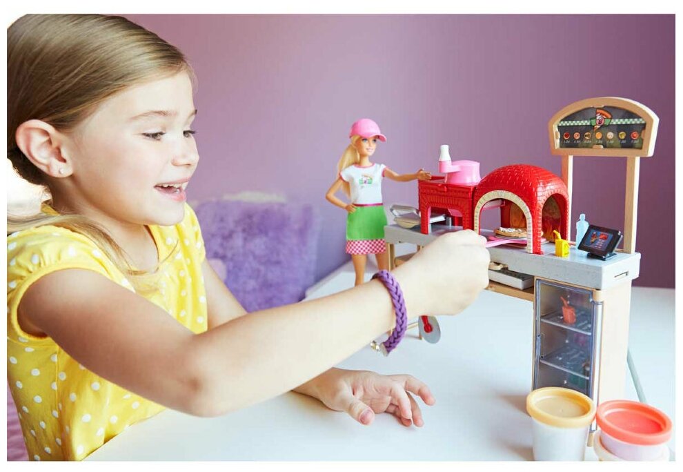 | Комплектация | кукла Барби в костюме работника пиццерии, кухонная стойка с полкой, баночки с 3 разновидностями теста по 107 гр., аксессуары |