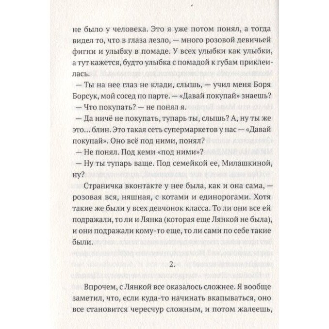 Книгу с одинаковым интересом прочитают и дети и взрослые. Мягкая обложка, бумага офсет, иллюстрации отсутствуют. Рекомендую для чтения 16 +. Собственно, ничего запретного в книге нет, но лучше ее читать, когда уже есть голова на плечах, чтобы сделать верные выводы. Читается очень легко, держит внимание и интригу до самого конца. И что интересно: несмотря на достаточно спорную тему, на кажущуюся безысходность, книга в результате получилась светлая. Прочитав ее понимаешь многое о ценности простого человеческого общения. И понимаешь, как важно рядом иметь друга, с которым можно просто одновременно расхохотаться ни с того, ни с сего.